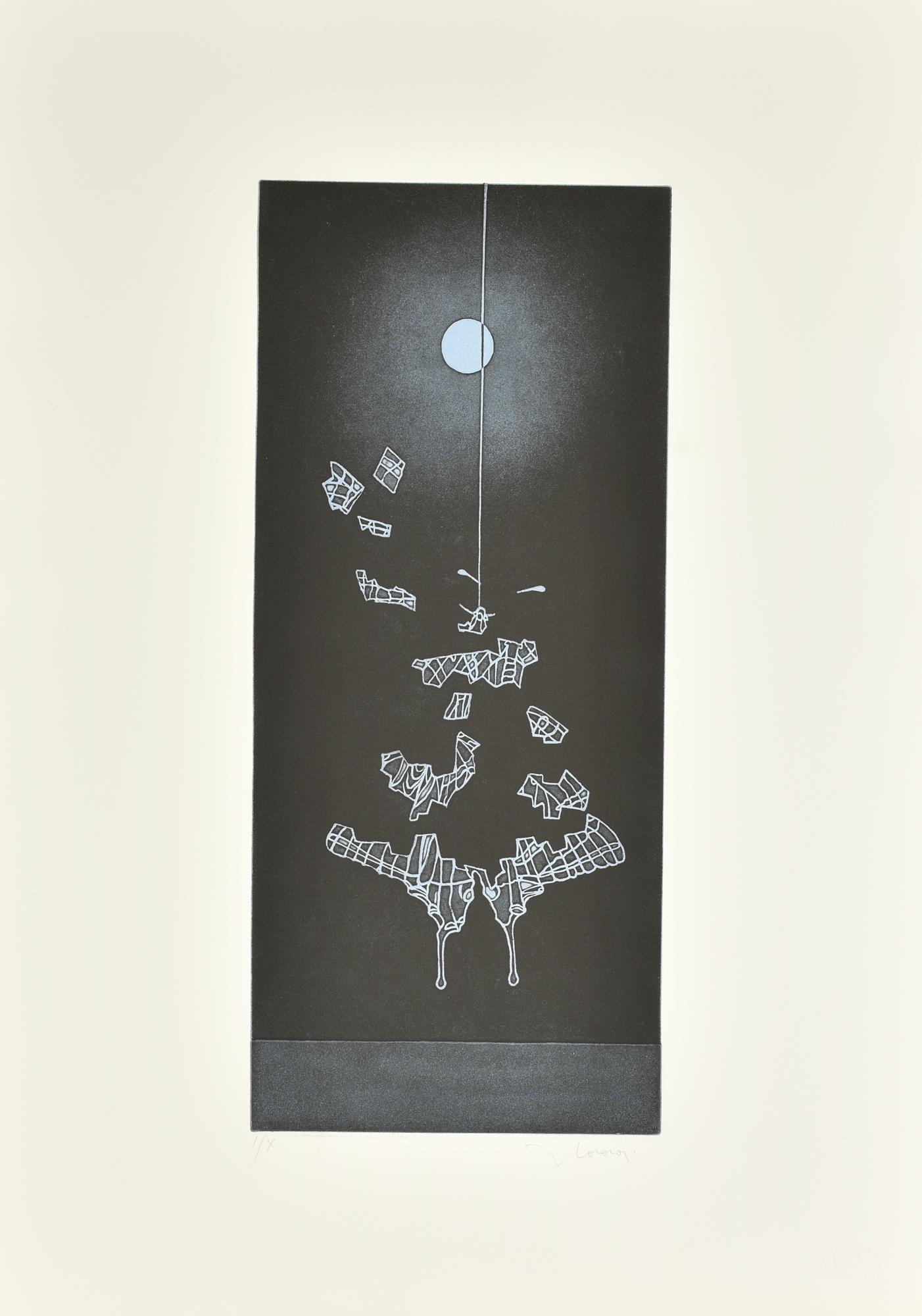 Francesco Casorati LUNA E FARFALLA incisione su carta, battuta cm 50x22, su...