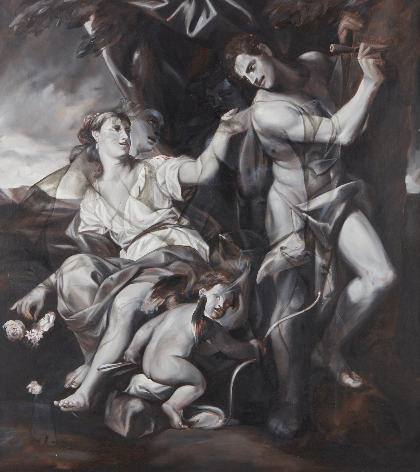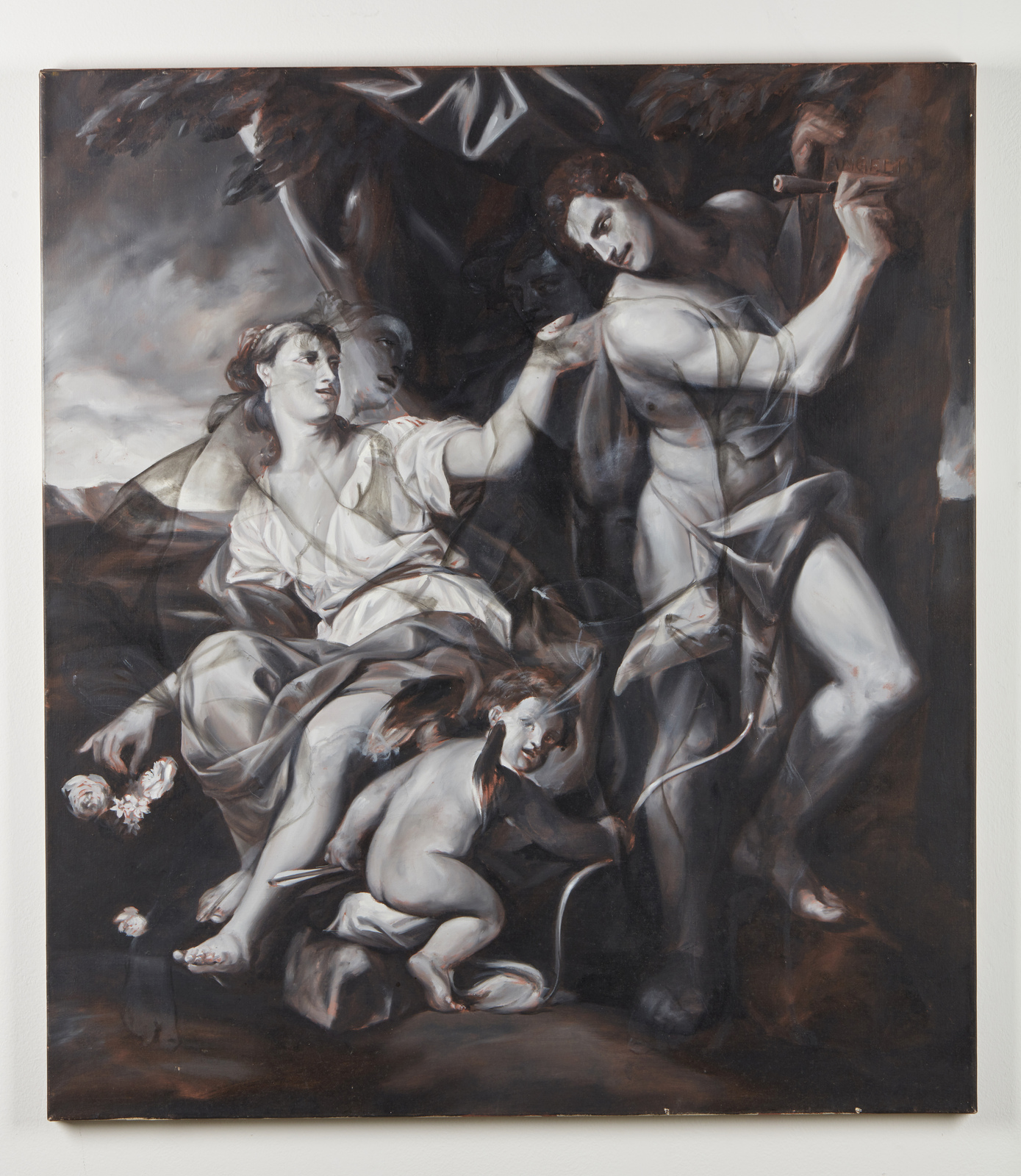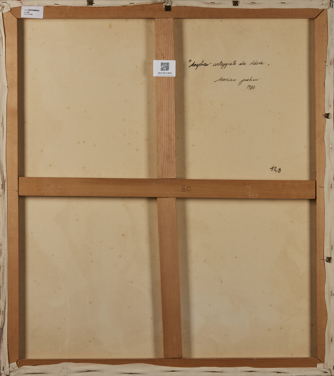 PULINI MASSIMO (n. 1958) Angelica corteggiata da Adone. 1984. Olio su tela . Cm 80,00 x 90,00. Al retro titolo, firma e anno. Lievi difetti.
