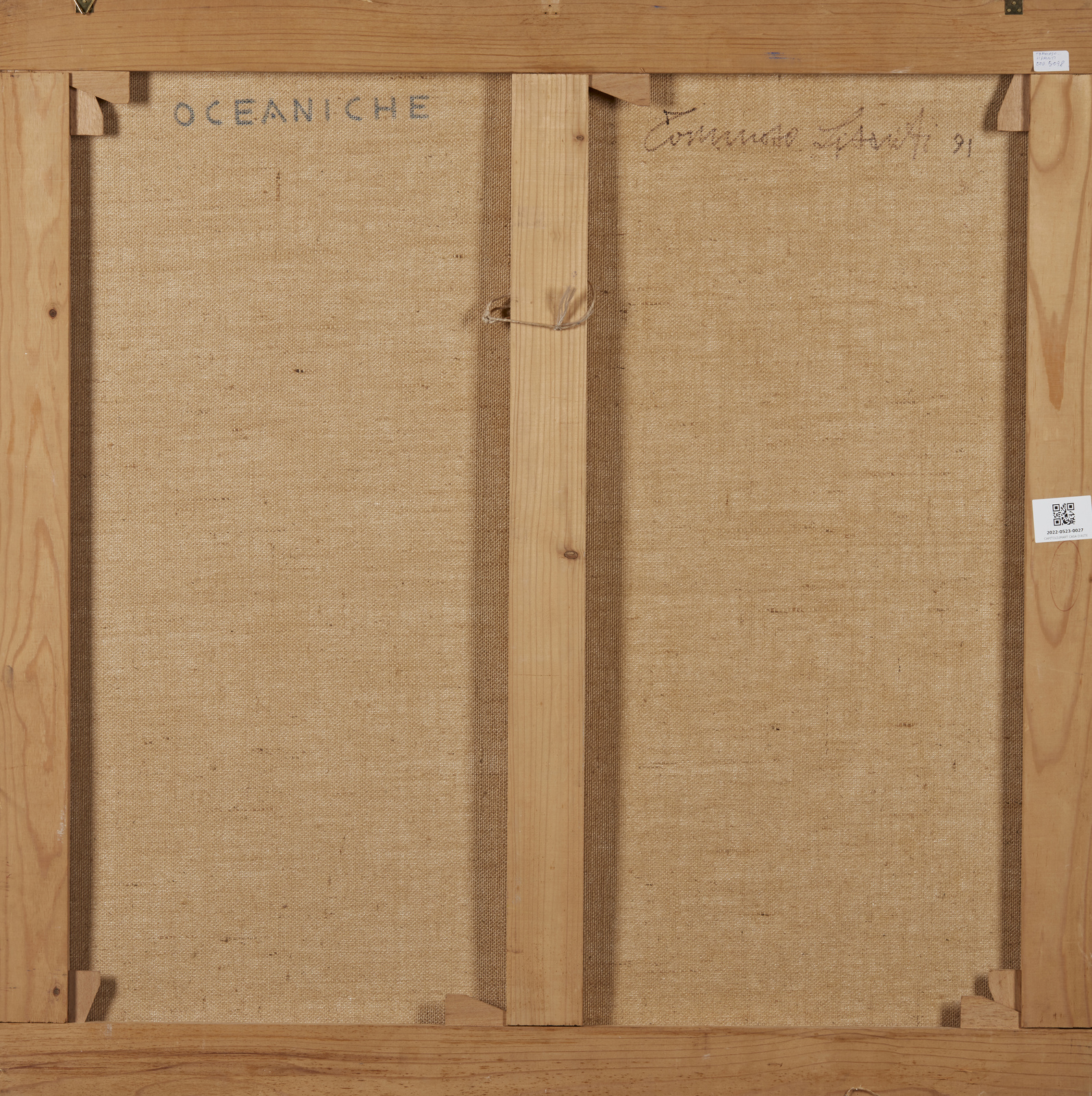 LISANTI TOMMASO (n. 1956) Oceaniche. 1991. Olio su tela . Cm 100,00 x 100,00. Al retro titolo, firma e anno. Autentica dell'artista su fotografia. Entro teca di plexiglass. Cornice presente