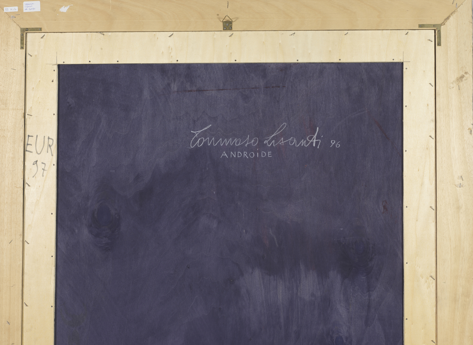 LISANTI TOMMASO (n. 1956) Androide. 1996. Acrilico su tavola. Cm 80,00 x 100,00. Al retro titolo, firma e anno. Autentica dell'artista su fotografia. Cornice presente