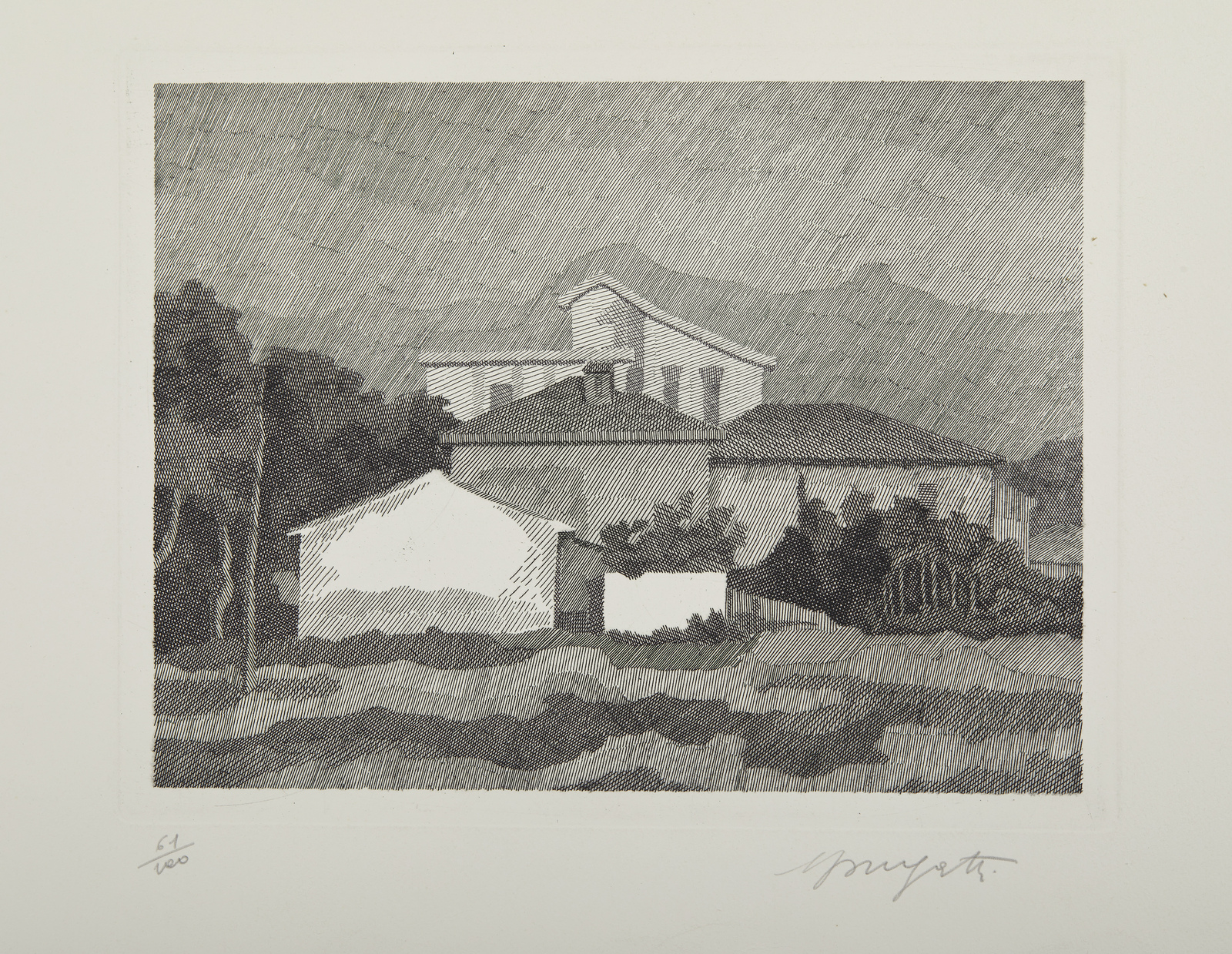 MORGATTI VAIRO (n. 1934) Dalla cartella 5 acqueforti. Acquaforte. Cm 65,50 x 44,70. 61/100. Tiratura e firma in basso a matita. Dimensioni lastra: 23,5x30 cm. Timbro a secco Graphis Arte, Livorno.