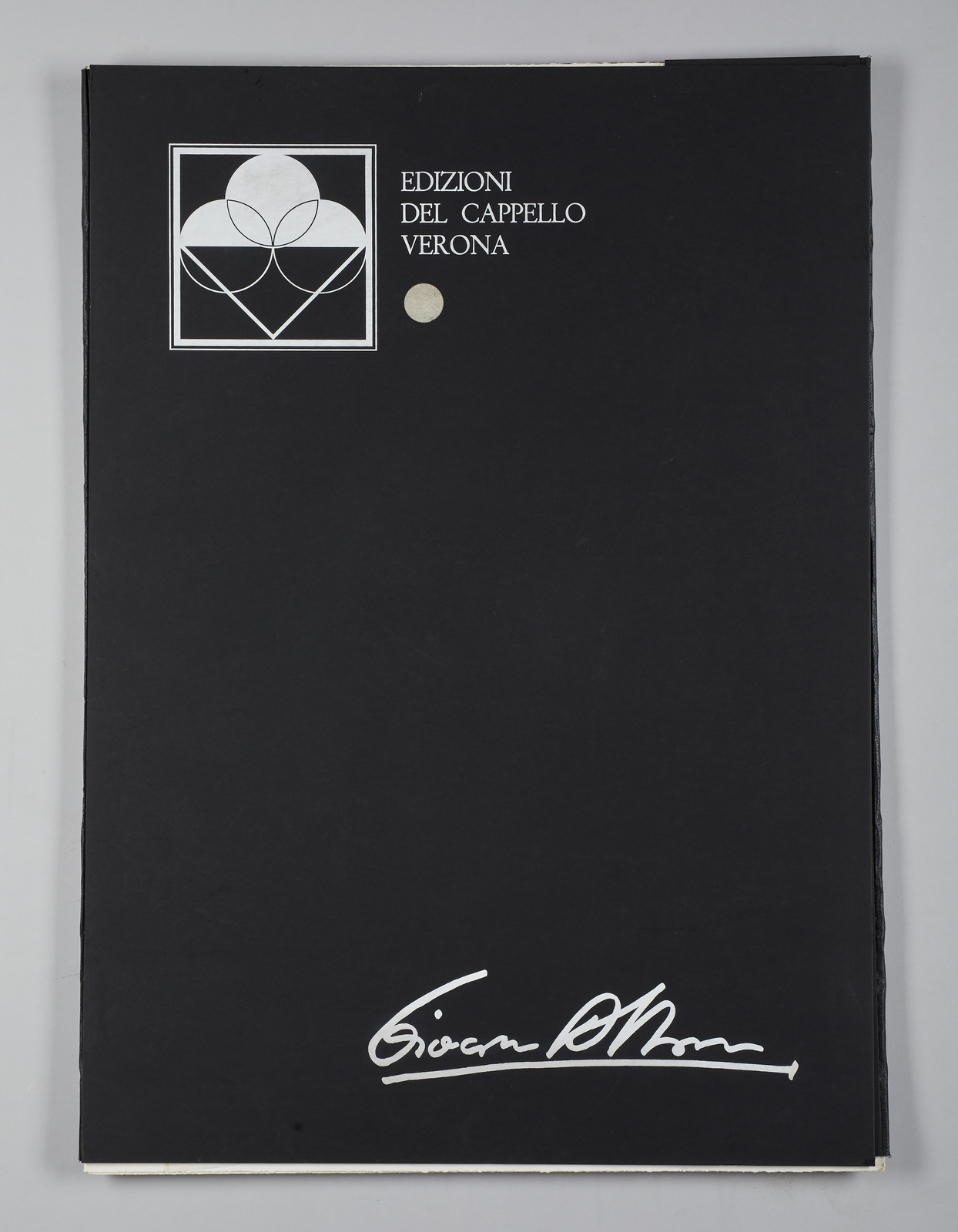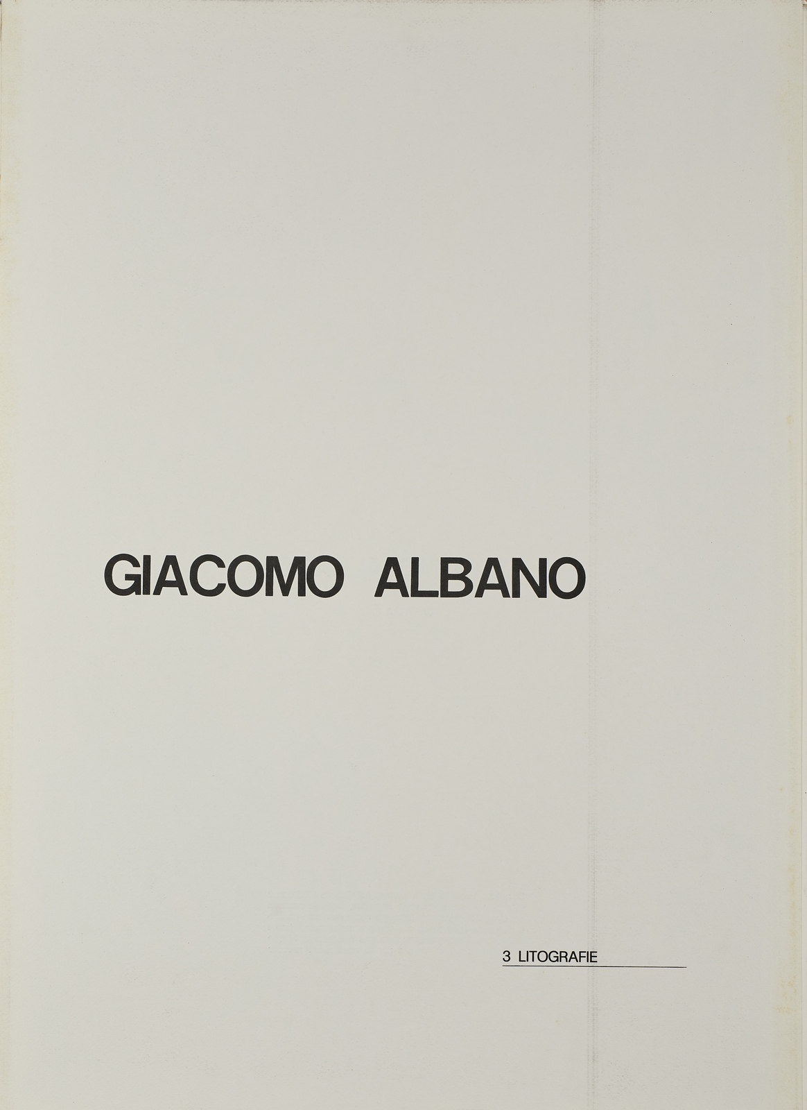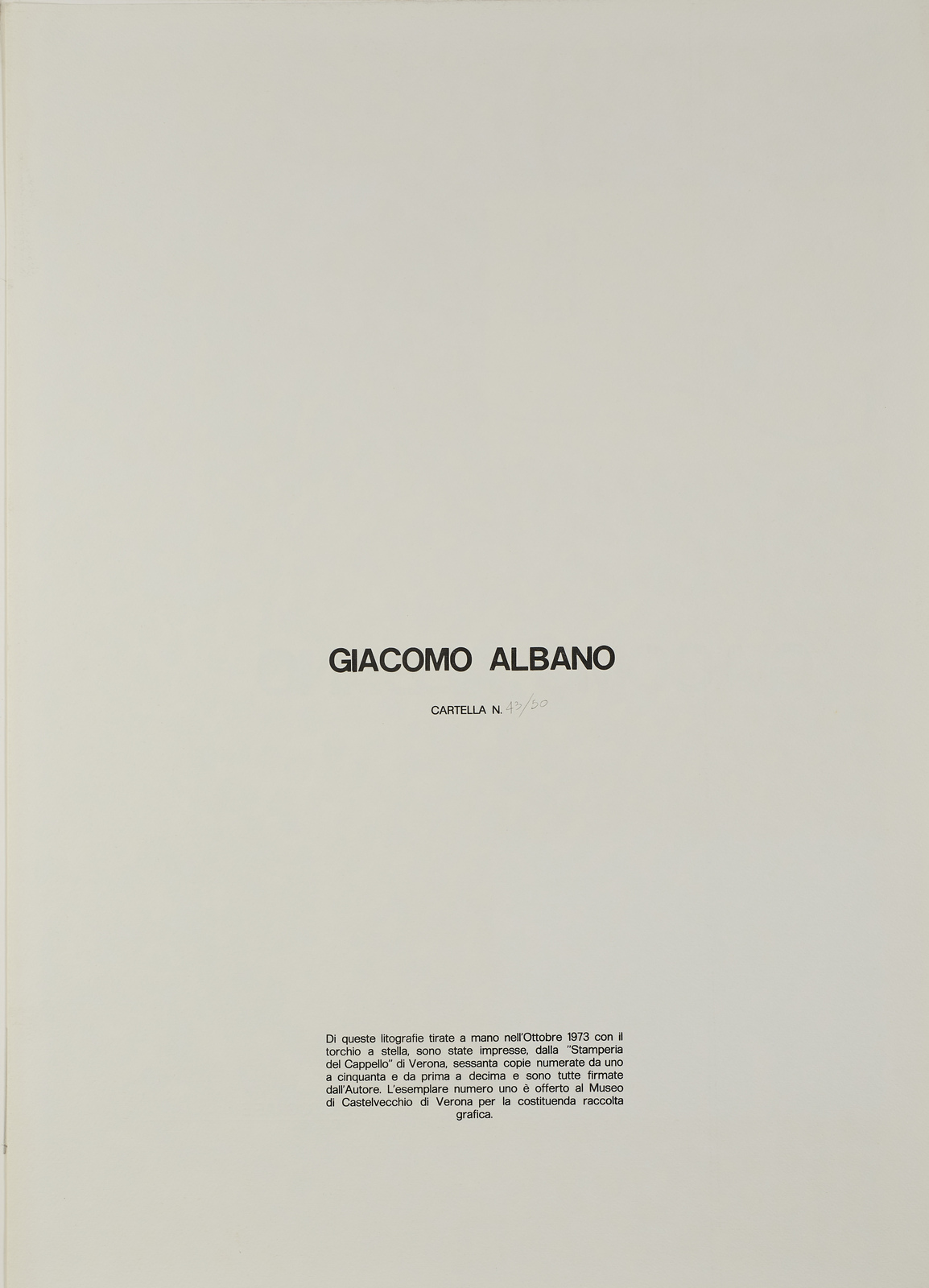 ALBANO GIACOMO (n. 1935) Cartella composta da n. 3 fogli. 1973. Litografia (cartella completa). Cm 70,00 x 50,00. 43/50. Tiratura e firma in basso a matita. Timbro a secco Comune di Verona Musei d'arte. Edizione totale composta da 60 opere numerate da 1 a 50 e da I a X.