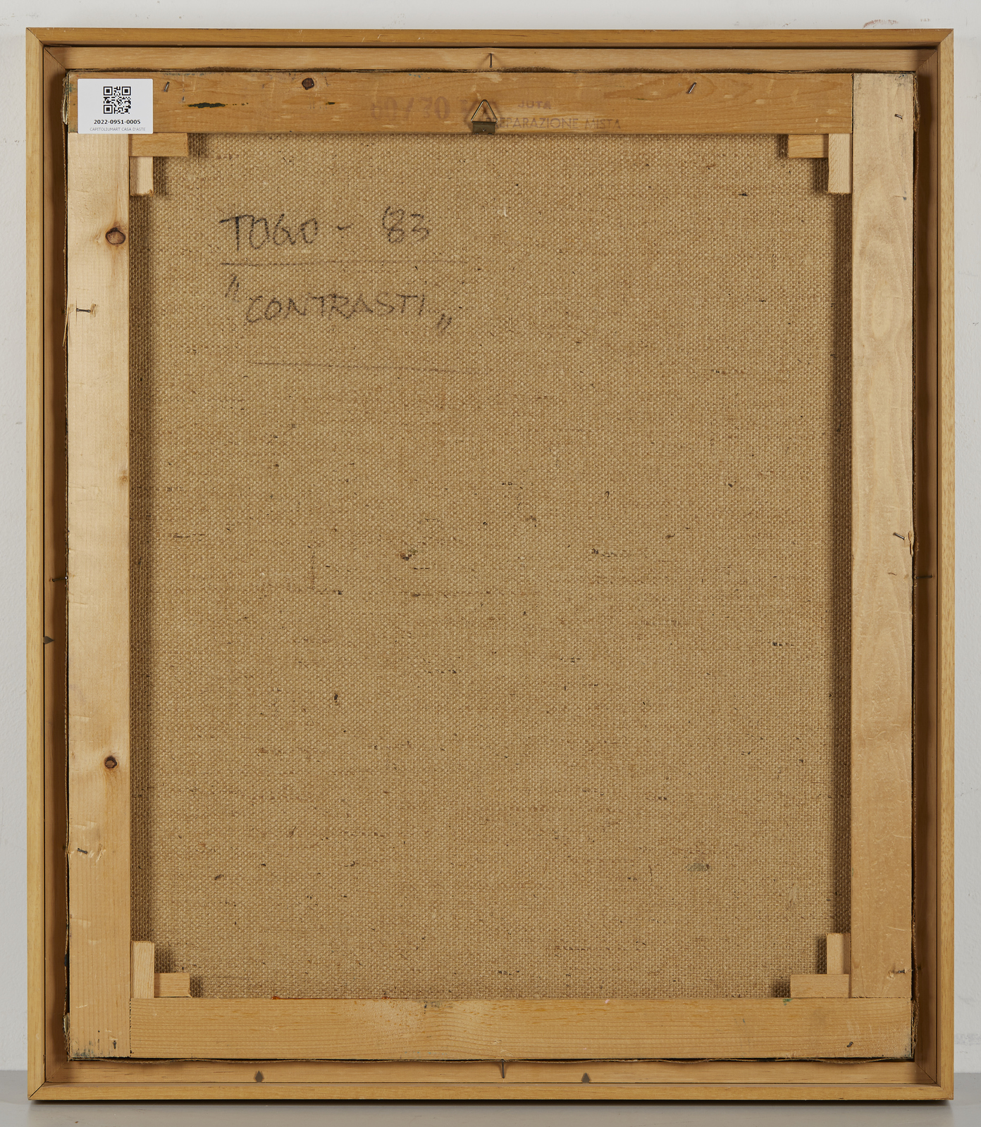 TOGO (n. 1937) Contrasti. 1983. Olio su tela . Cm 60,00 x 70,00. Firma in basso a sinistra. Al retro titolo, firma e anno. Cornice presente