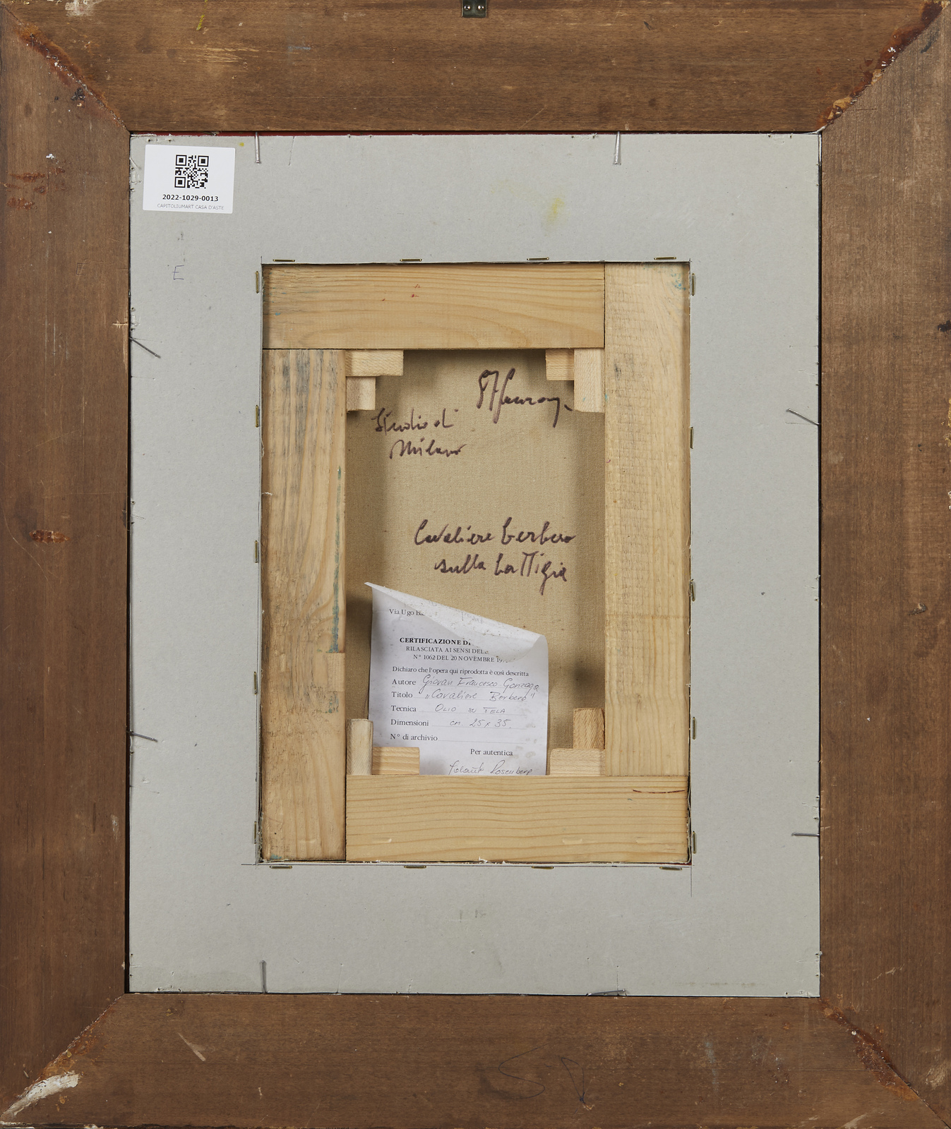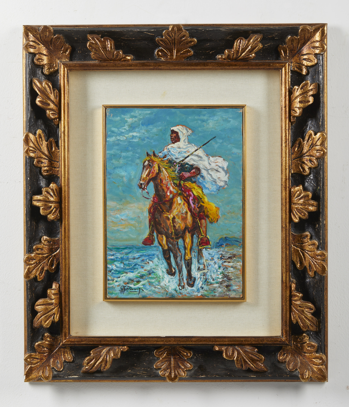 GONZAGA GIOVANFRANCESCO (1921 - 2007) Cavaliere berbero sulla battigia. Olio su tela . Cm 25,00 x 35,00. Firma in basso a sinistra e al retro. Certificato di autenticità rilasciato dalla Galleria d'arte e casa d'aste Rosenberg, Milano, al retro. Cornice presente