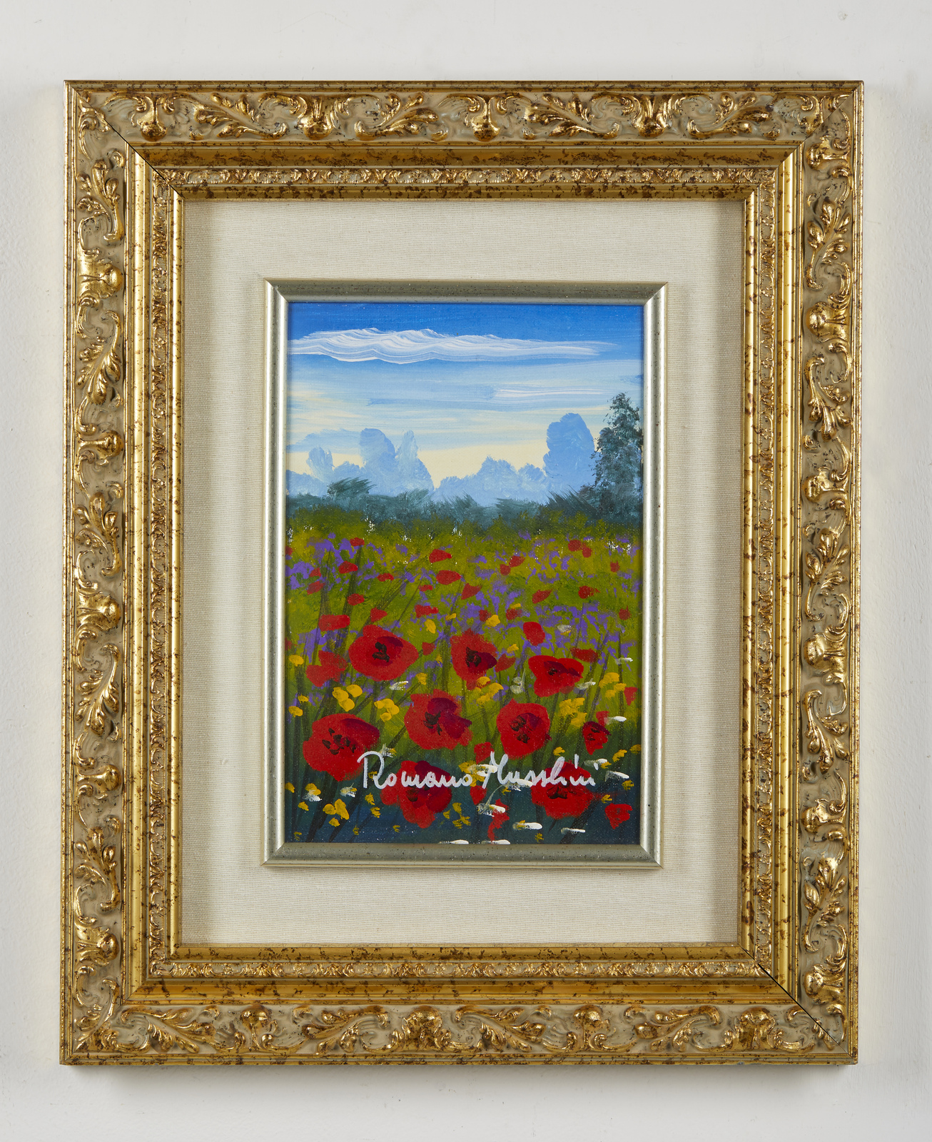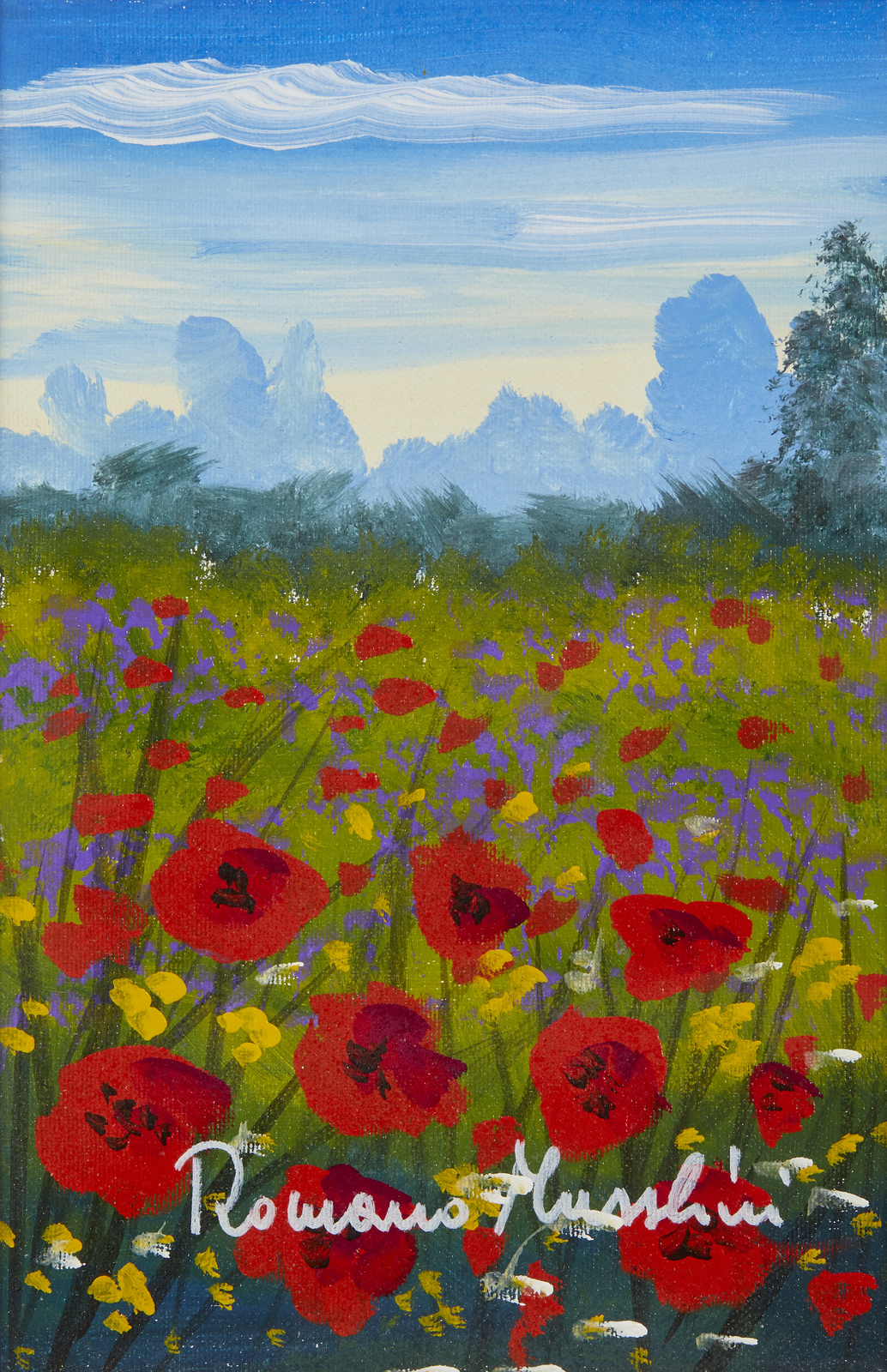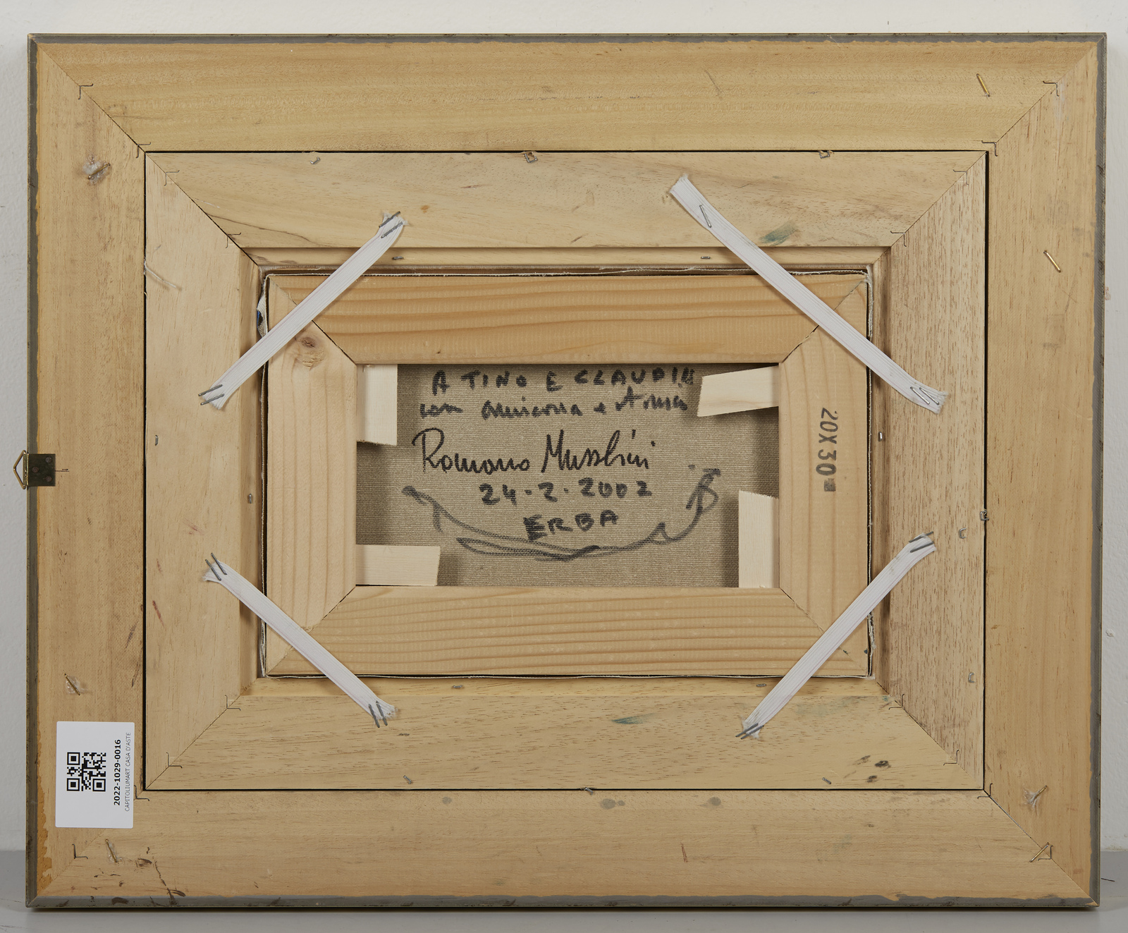 MUSSOLINI ROMANO (1927 - 2008) Erba. 2002. Olio su tela . Cm 20,00 x 30,00. Firma in basso al centro. Al retro firma, titolo, anno e dedica. Cornice presente