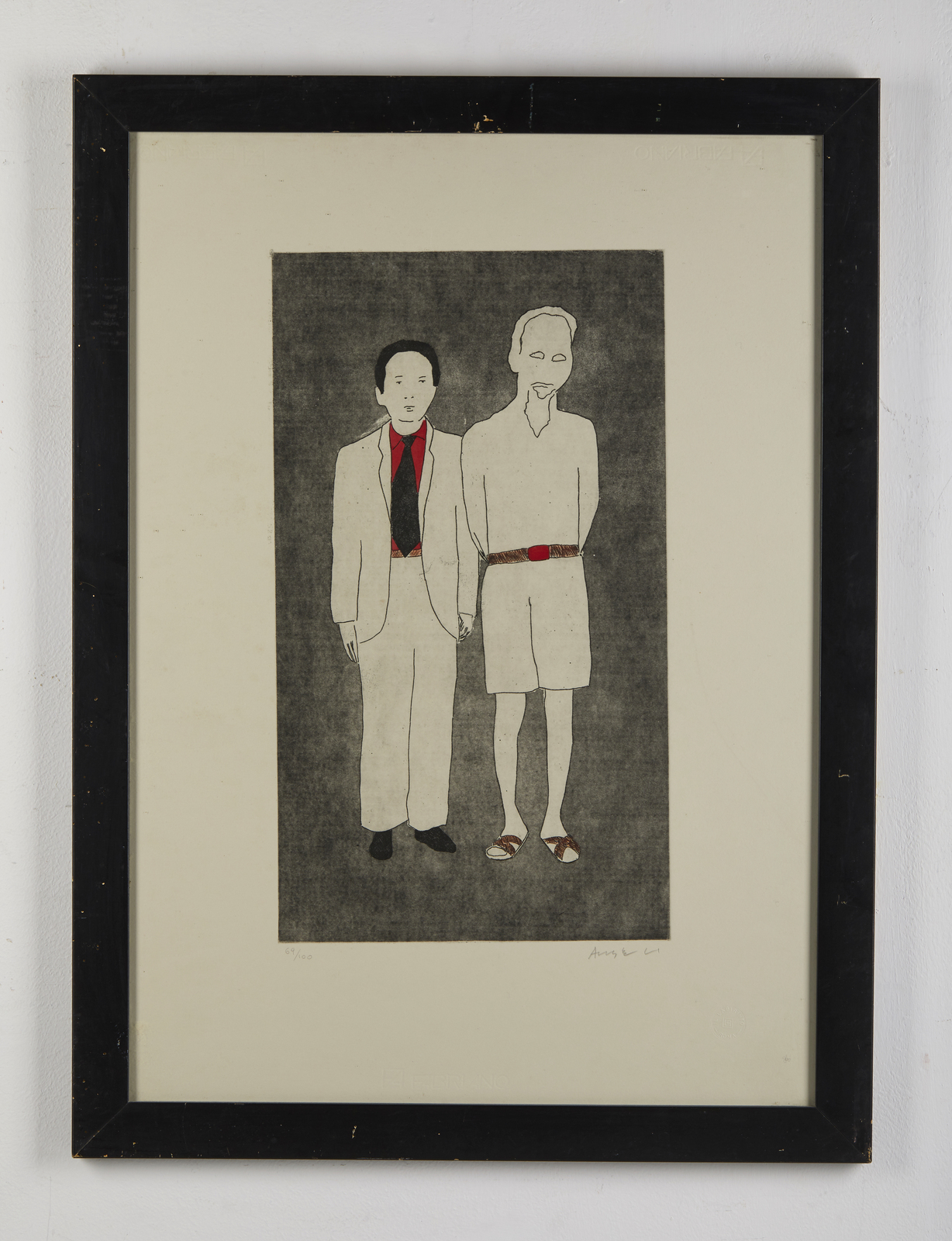 ANGELI FRANCO (1935 - 1988) Senza titolo. Acquaforte e acquatinta. Cm 50,00 x 70,00. 69/100. Tiratura e firma in basso a matita. Timbro a secco Galleria Il Labirinto, Roma, in basso a destra. Edizione totale: 100 esemplari. Dimensione lastra: 49x28 cm. Carta Fabriano, filigrana in basso e in alto. Cornice presente