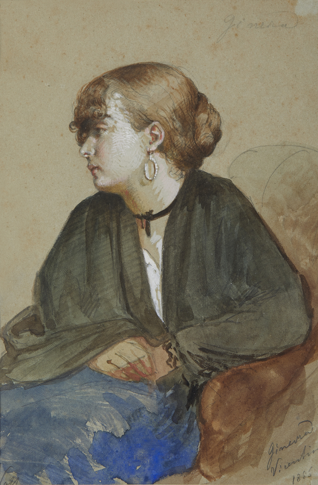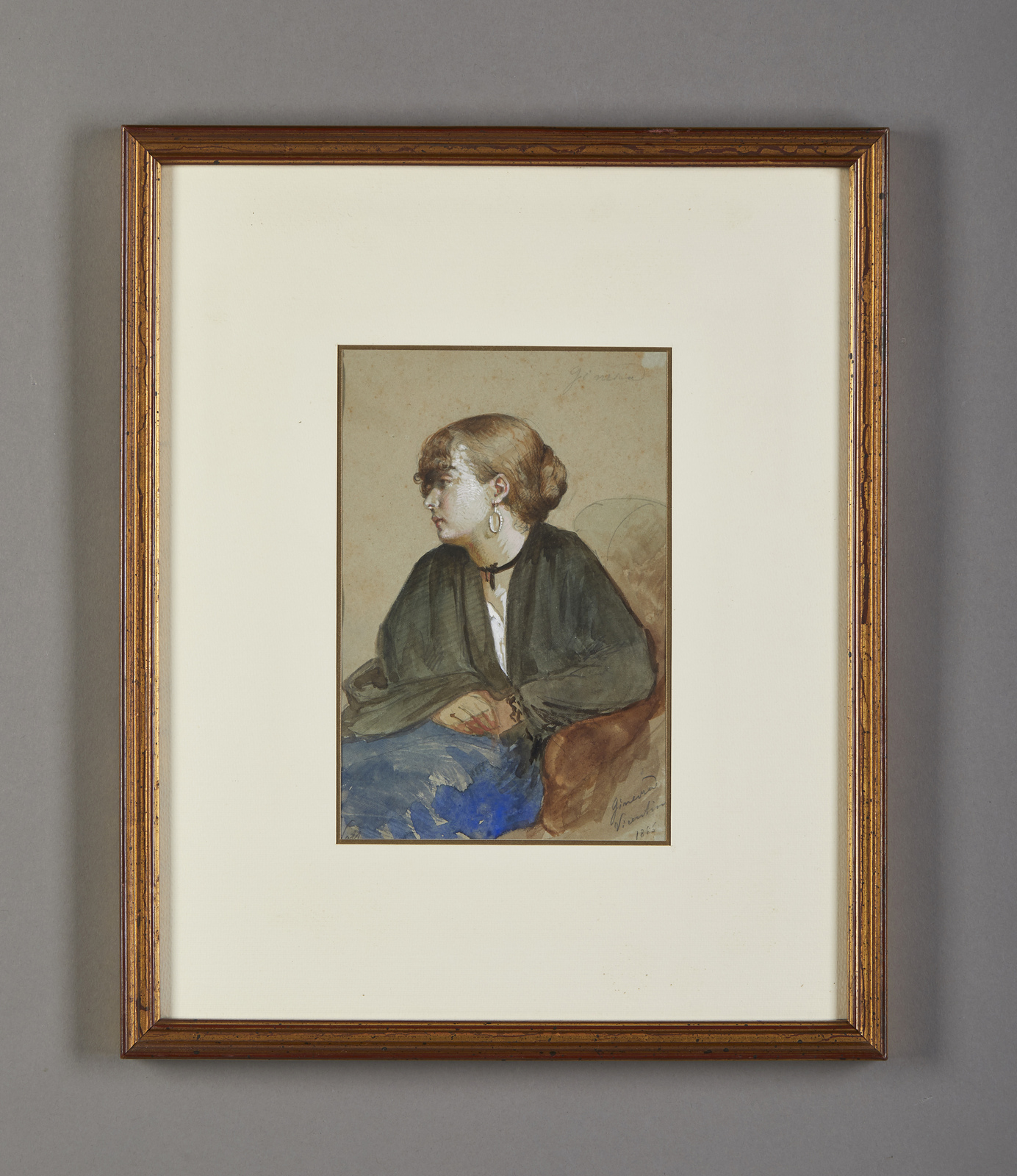 AUTORE NON IDENTIFICATO Senza titolo. 1885. Acquarello su cartoncino. Cm 14,00 x 22,00. Firmato Ginevra Vicentini e datato in basso a destra. Cornice presente