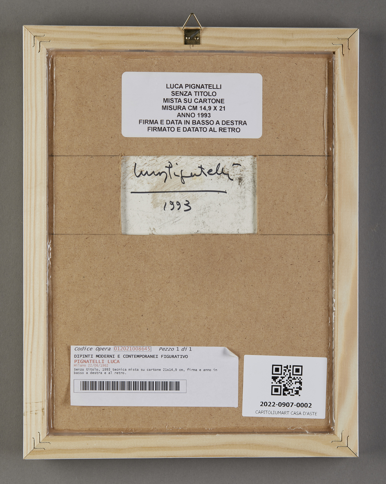 PIGNATELLI LUCA (n. 1962) Senza titolo. 1993. Tecnica mista su cartone. Cm 14,90 x 21,00. Firma e anno in basso a destra e al retro. Certificato di garanzia Meeting Art, Vercelli. Cornice presente