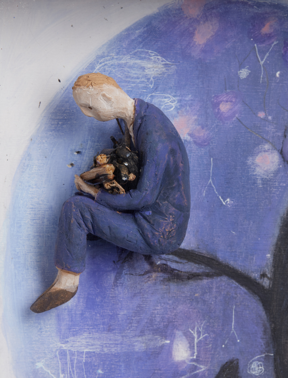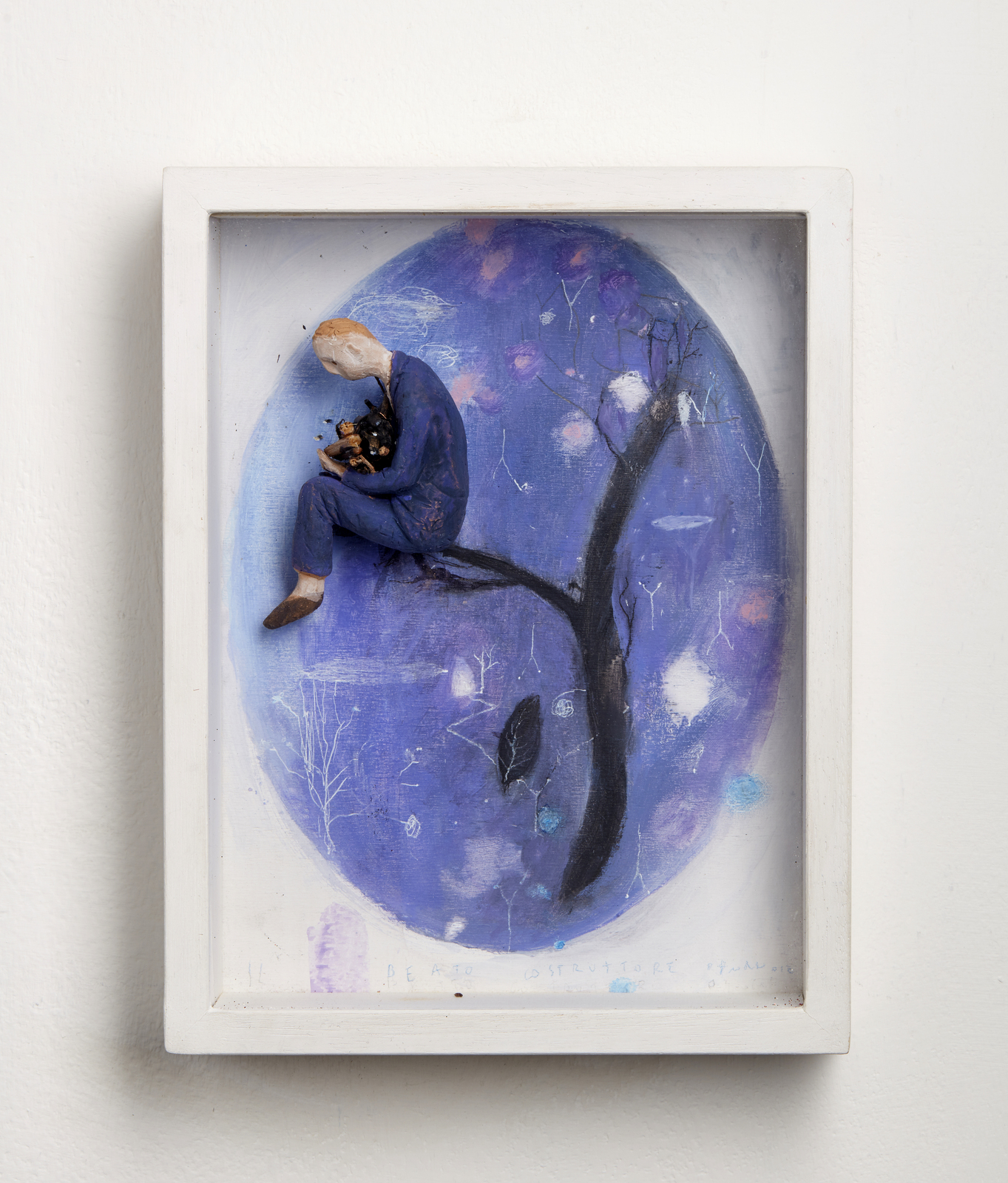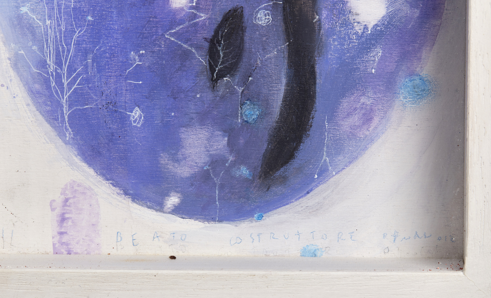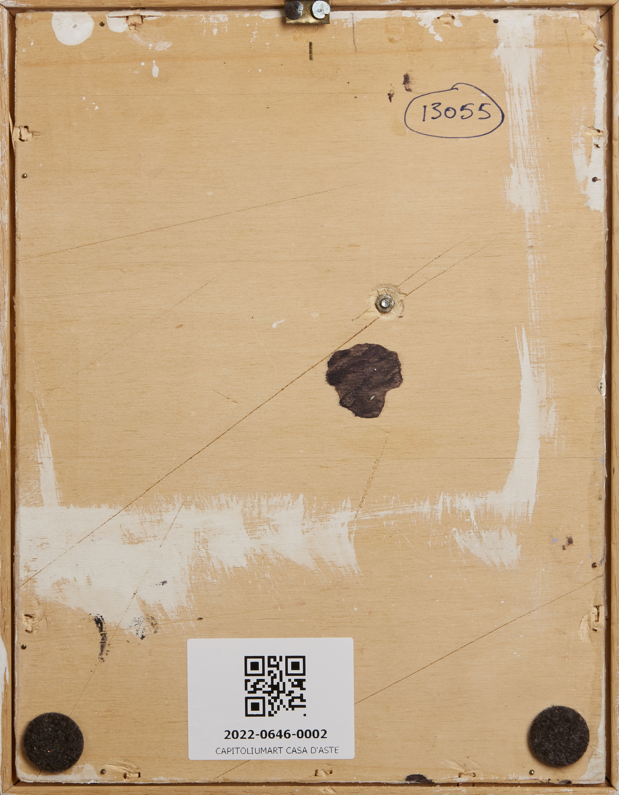 DEODATO PINO (n. 1950) Il Beato Costruttore. . 2013. tecnica mista collage su tavola. Cm 18,80 x 24,60. Firma e titolo in basso al centro. Autentica dell'artista su fotografia. Cornice presente