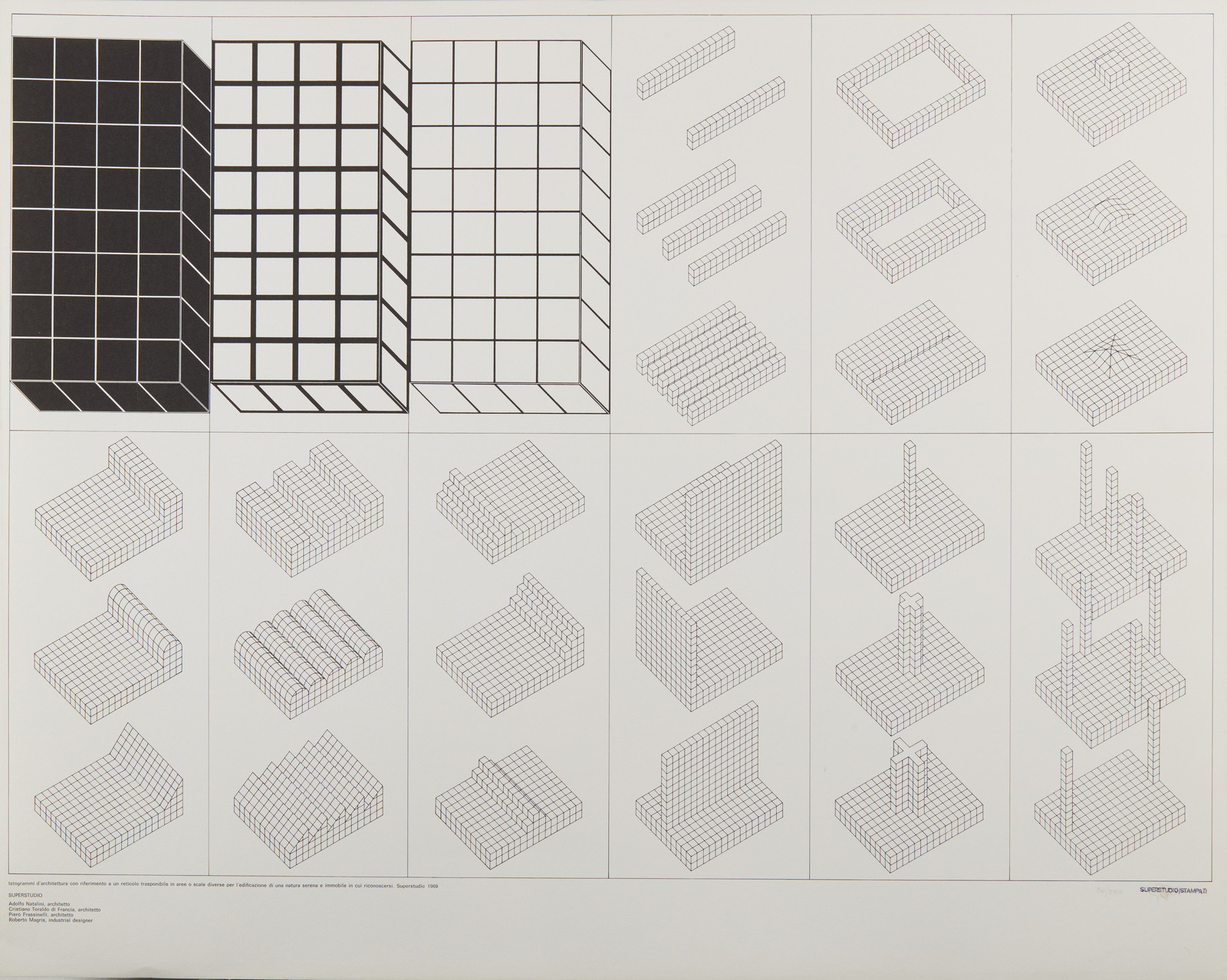 SUPERSTUDIO Istogrammi d'architettura. 1969. Litografia. Cm 86,50 x 68,50. 242/500. Tiratura, firma a matita e penna in basso a destra. Titolo e anno a stampa in basso a sinistra. Il gruppo Superstudio, fondato a Firenze nel 1967 e composto da Adolfo Natalini, Cristiano Toraldo di Francia, Roberto Magris, Piero Frassinelli, Alessandro Magris, con Alessandro Poli dal 1970 al 1972, è stato attivo fino al 1978 e ha svolto attività di ricerca sperimentale e teorica sulla progettazione. Con gli Istogrammi d’Architettura, Superstudio, portava a compimento il percorso di antidesign, in cui vengono rappresentati dei diagrammi mentali liberi da modelli e imitazioni. Foto esemplificativa.