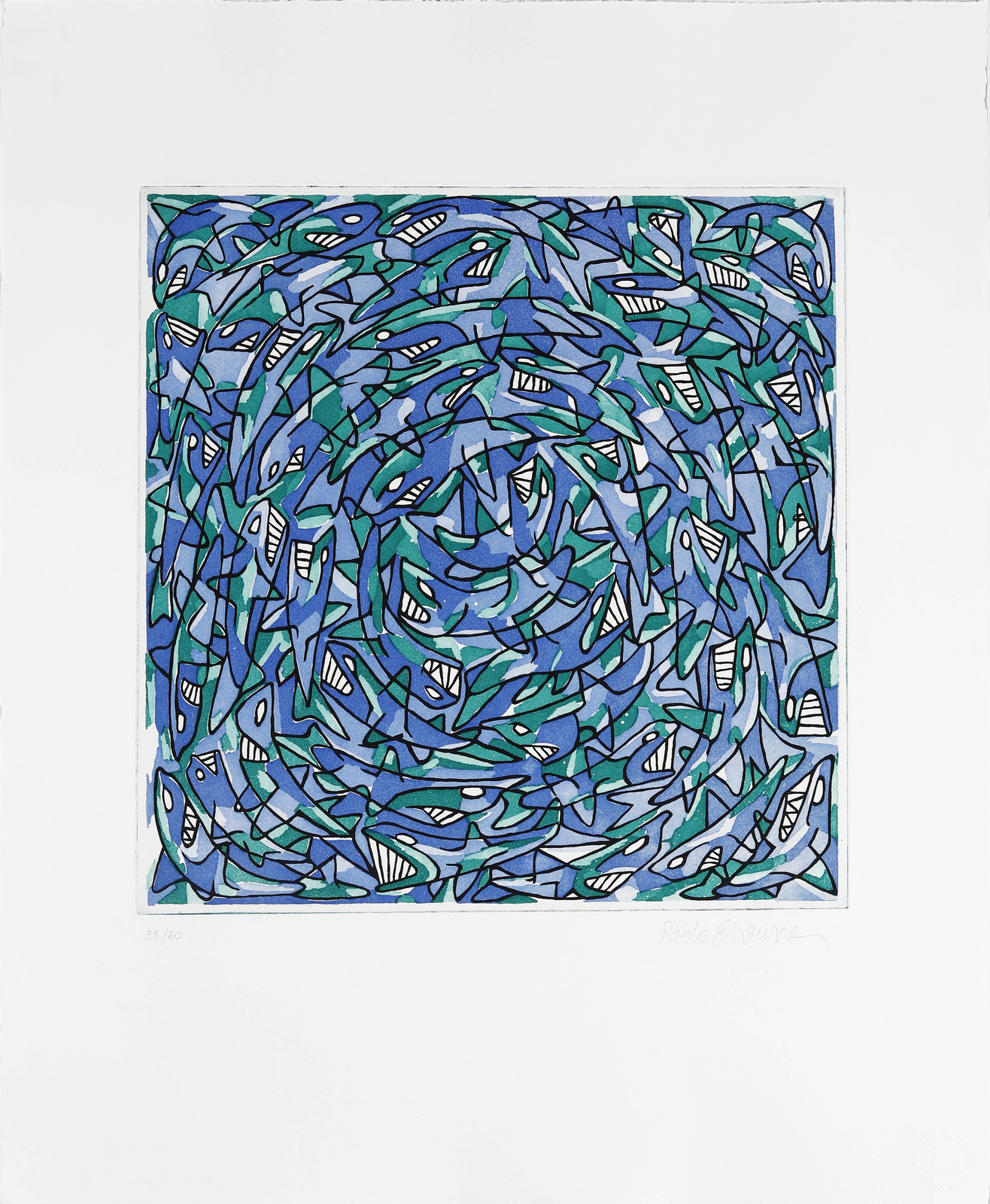 ECHAURREN PABLO (n. 1951) Senza titolo. . Acquatinta. Cm 50,00 x 60,00. 31/60. Tiratura e firma in basso a matita. Edizione totale: 60 +VII. Dimensione lastra: 35.5x35.5 cm. Timbro a secco Stamperia Berardinelli, Verona, in basso a destra.