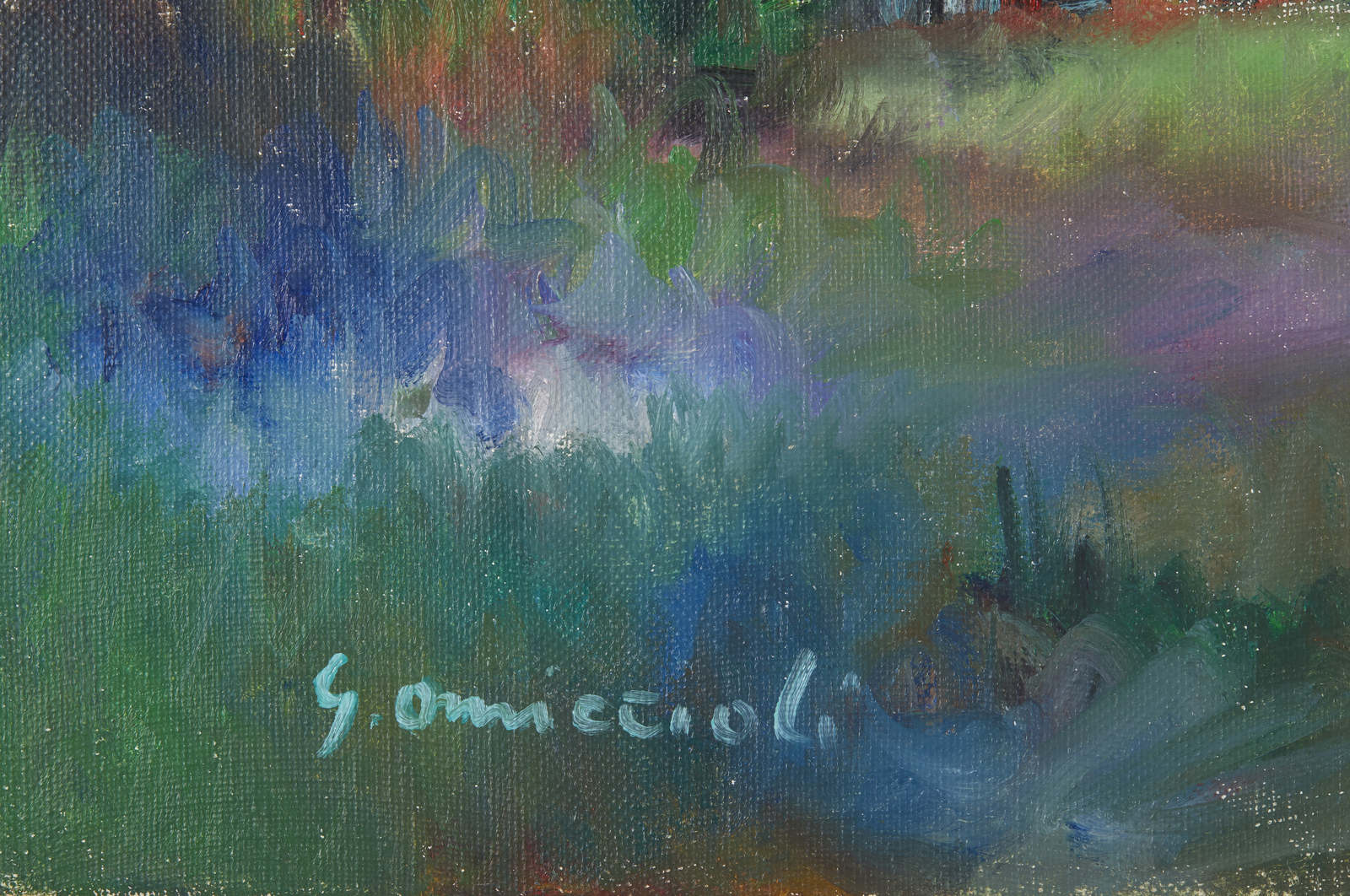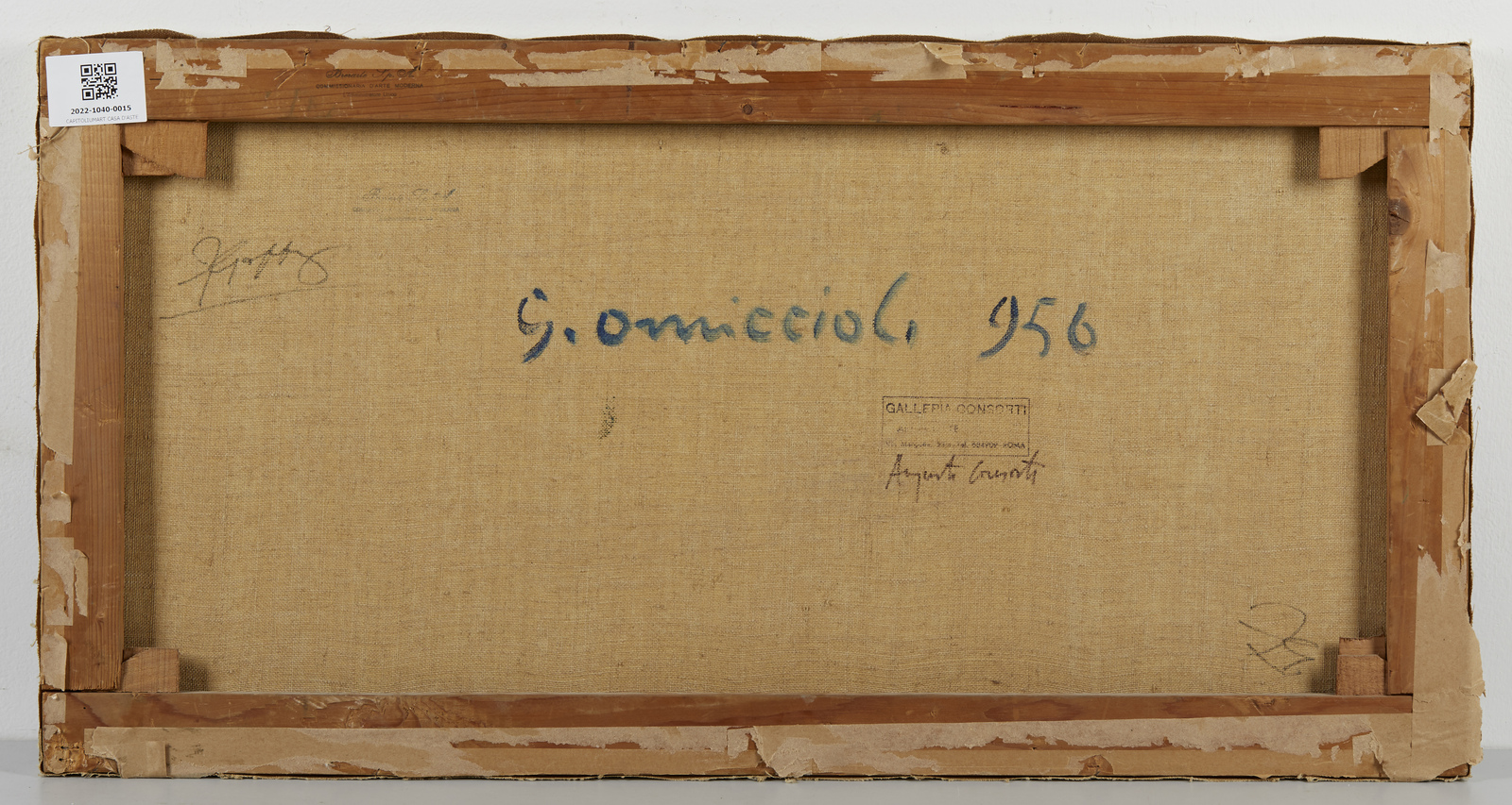 OMICCIOLI GIOVANNI (1901 - 1975) Senza titolo. 1956. Olio su tela . Cm 78,00 x 40,00. Firma in basso a sinistra. Al retro firma, anno e timbri della Galleria A. Consorti, Roma e di Brerarte S.p.a, Milano. Autentica dell'artista su fotografia con timbro della Galleria A. Consorti, Roma.