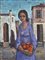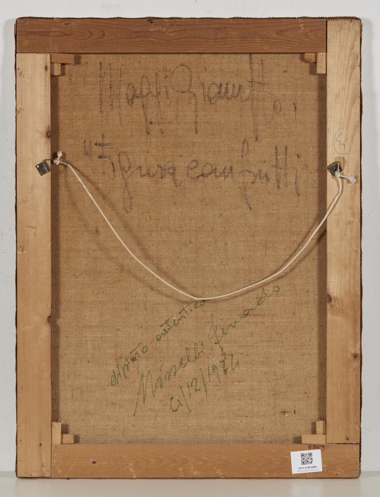 MAGGI GIAMPIETRO (n. 1934) Figura con frutti. 1975. Olio su tela . Cm 60,00 x 80,00. Firma in basso a sinistra. Al retro titolo e firma. Autentica dell'artista su fotografia con timbro Galleria Il Cigno, Salerno. Lievi difetti.