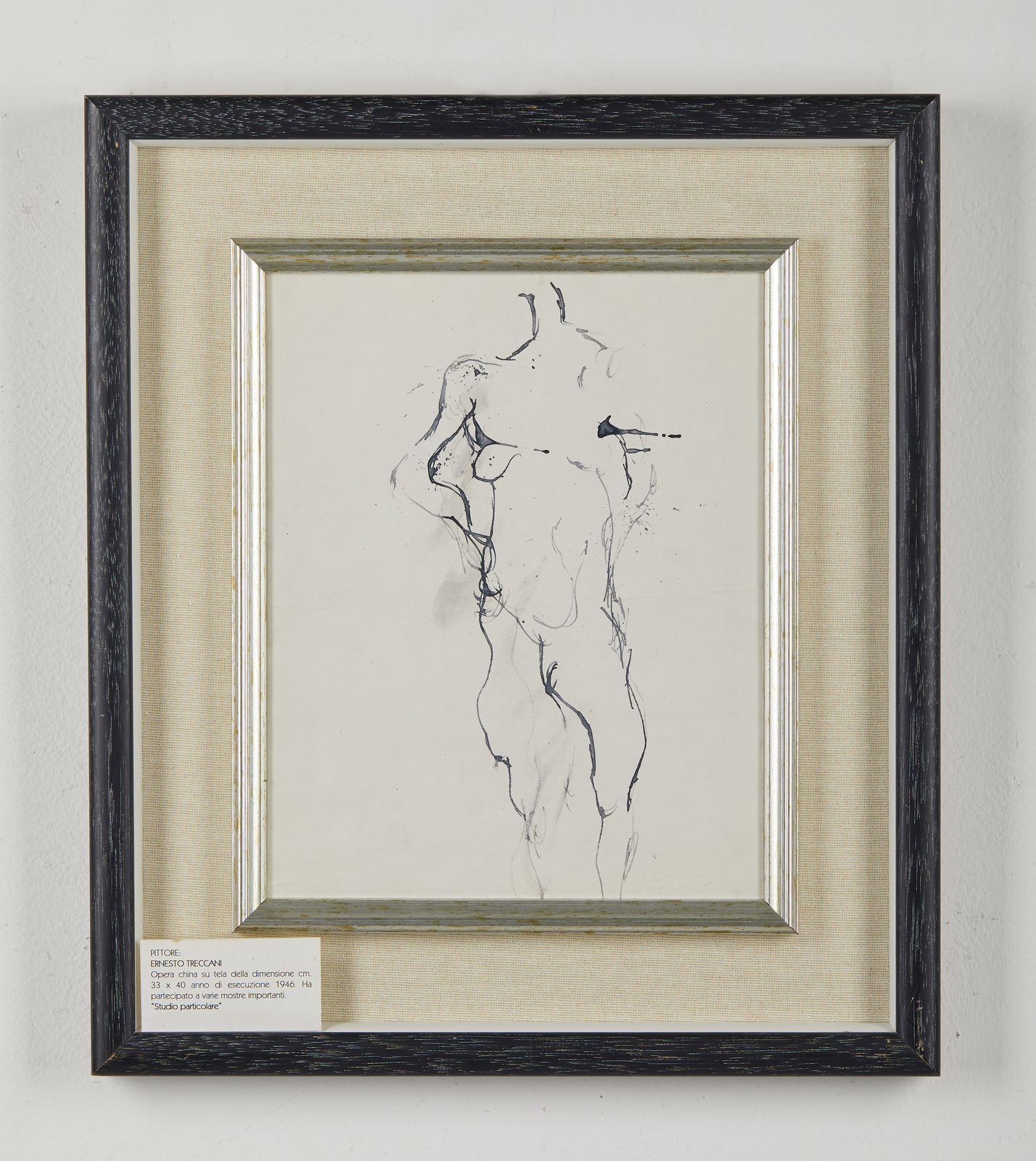 TRECCANI ERNESTO (1920 - 2009) Senza titolo. china su carta applicata su tela. Cm 22,00 x 28,00. Firna in basso a destra. Al retro timbro Galleria Il Castello, Adria. Autentica dell'artista su fotografia. Cerificato di provenienza Galleria d'arte Box Art, Thiene. Cornice presente