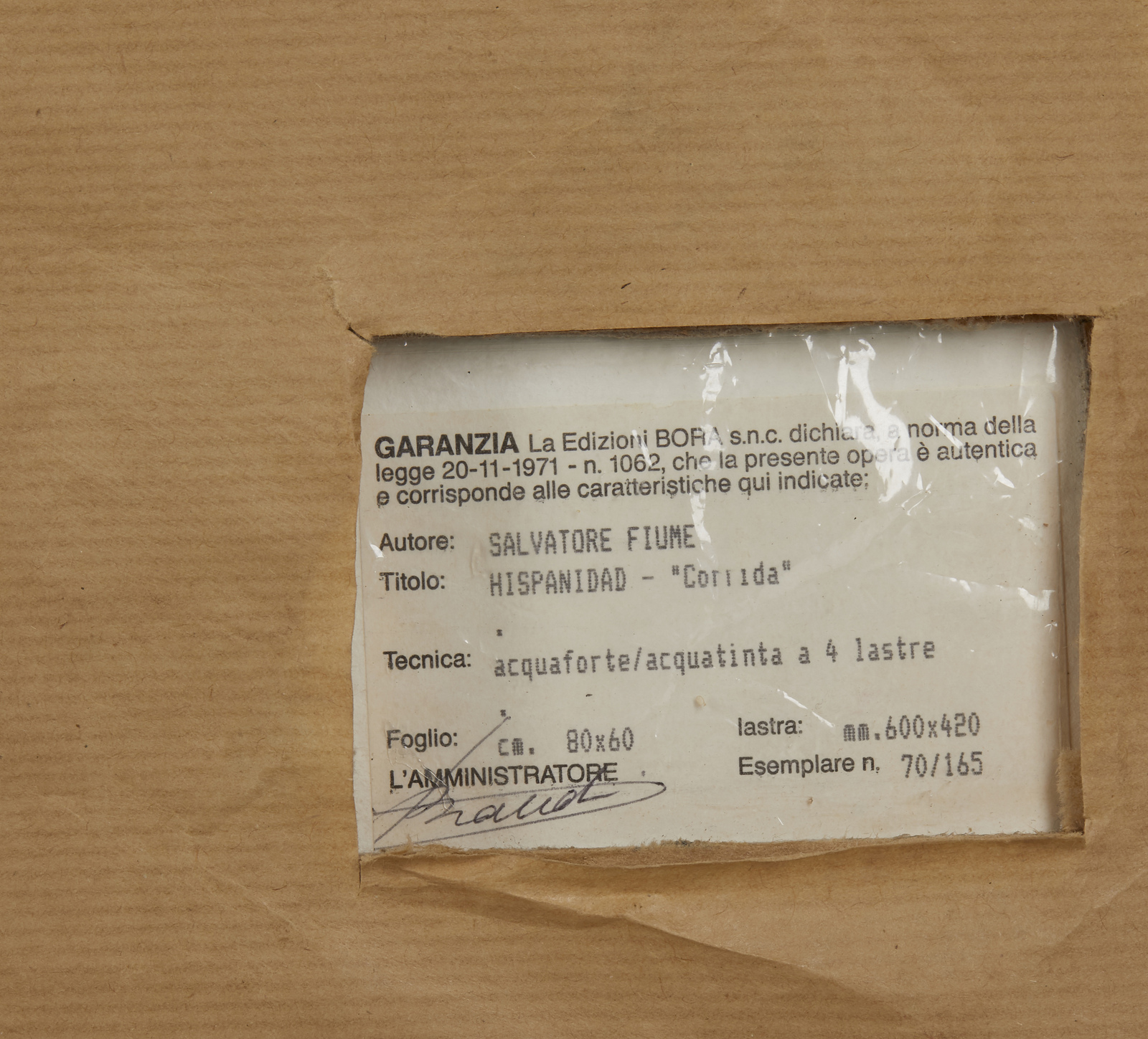FIUME SALVATORE (1915 - 1997) Hispanidad - "Corrida". Acquaforte. Cm 80,00 x 60,00. 70/165. Tiratura e firma in basso a matita. Dimensione lastra: 42x60 cm. Esposizioni: Mostra di pittura "Storia per immagini di una Collezione 1956-1998", Galleria del Risorgimento, Imola, 7-20 maggio 1998; Mostra di pittura nel 58° anniversario della morte del partigiano Dante Cassani, Sala della Biblioteca comunale, 25 aprile - 5 maggio 2002. Al retro certificato di garanzia rilasciato da Edizioni Bora. Cornice presente