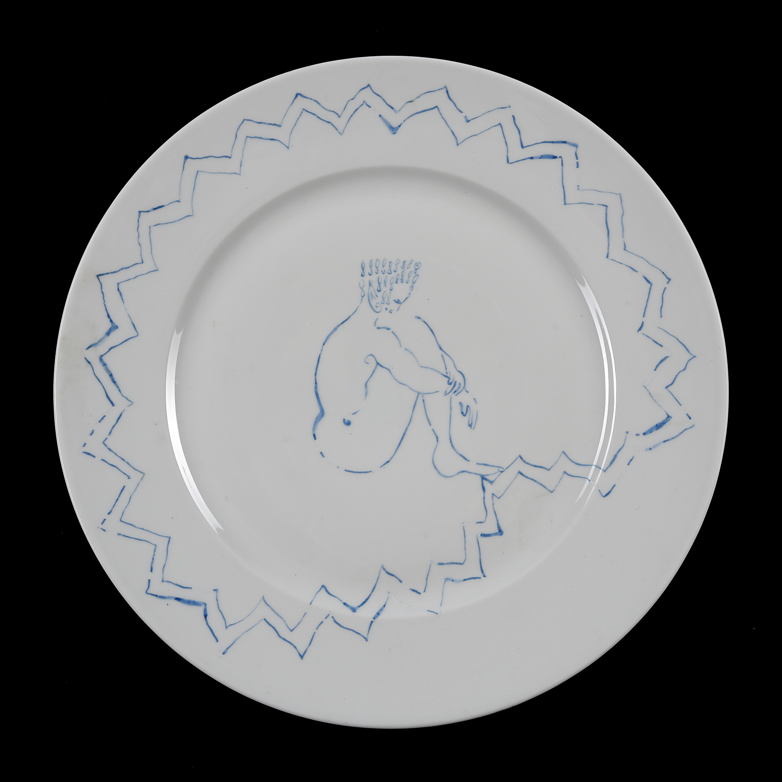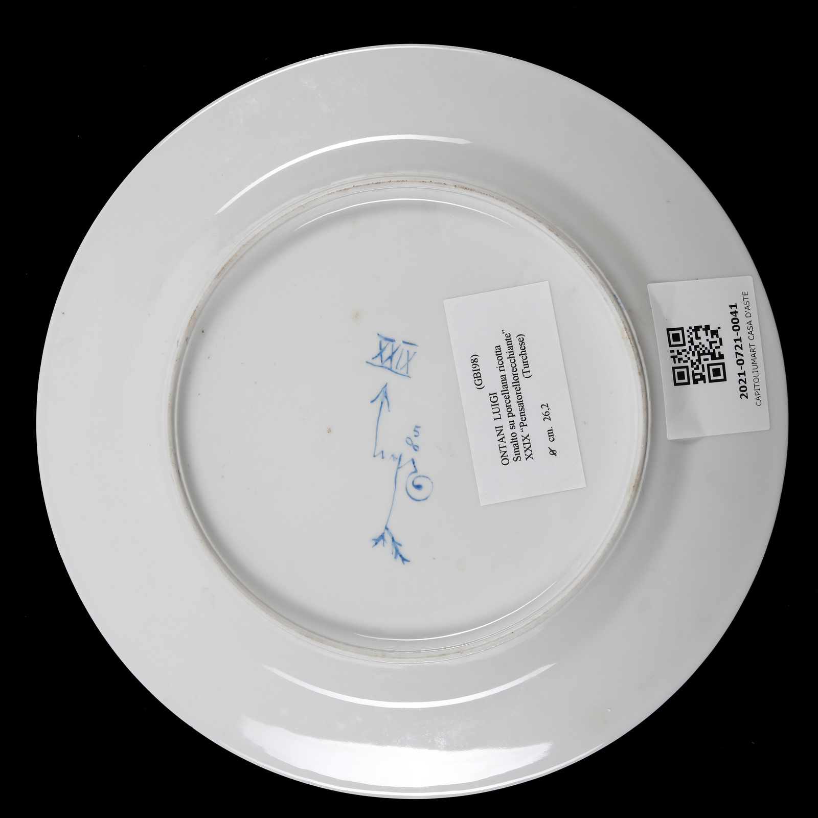 ONTANI LUIGI (n. 1943) Pensatorellorecchiante. 1985. Piatto in ceramica. Cm 26,00 x 26,00. Esemplare unico. Al retro firma e anno.