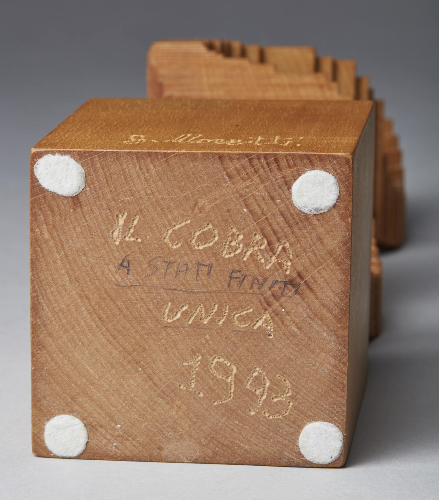 MORETTI GUIDO (n. 1947) Cobra. 1993. scultura in legno. Cm 7,00 x 26,50 x 7,00. Firma, titolo e anno incise alla base. Autentica dell'artista su fotografia.