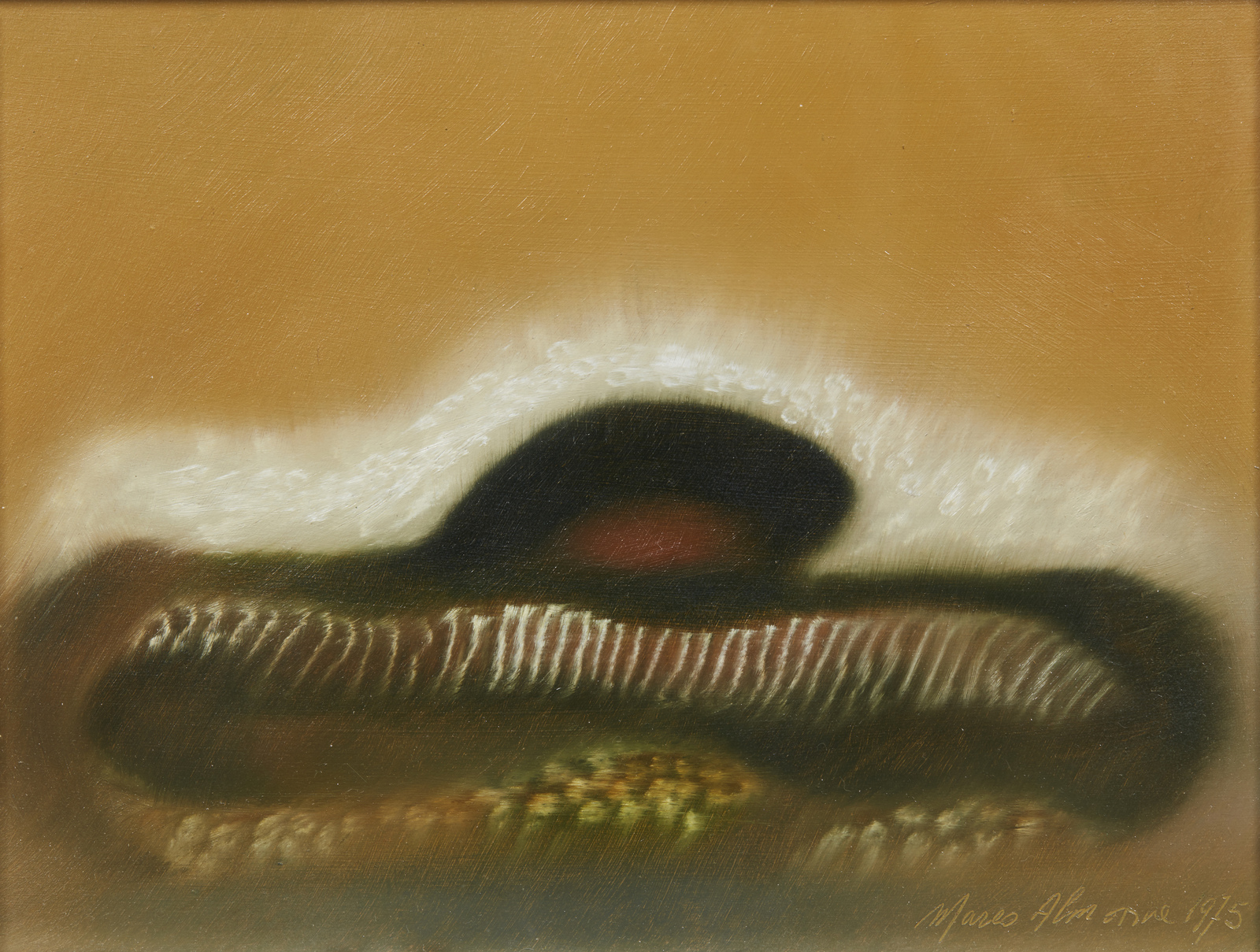 ALMAVIVA MARCO (n. 1934) Entro. 1975. Olio su tavola. Cm 18,00 x 23,00. Firma e anno in basso a destra. Al retro cartiglio della galleria d'arte Amaltea, Genova. . Cornice presente