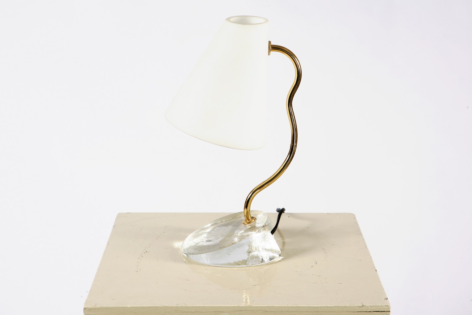 TOSO RENATO (N. 1940). Lampada modello Micetta. Base in cristallo,stelo in metallo dorato, diffusore in vetro soffiato. Micetta table lamp. Crystal base, gilded metal rod, blown glass. Cristallo, metallo dorato, vetro soffiato. Cm 22x35. Prodotto da Leucos. Produced by Leucos. 1980.