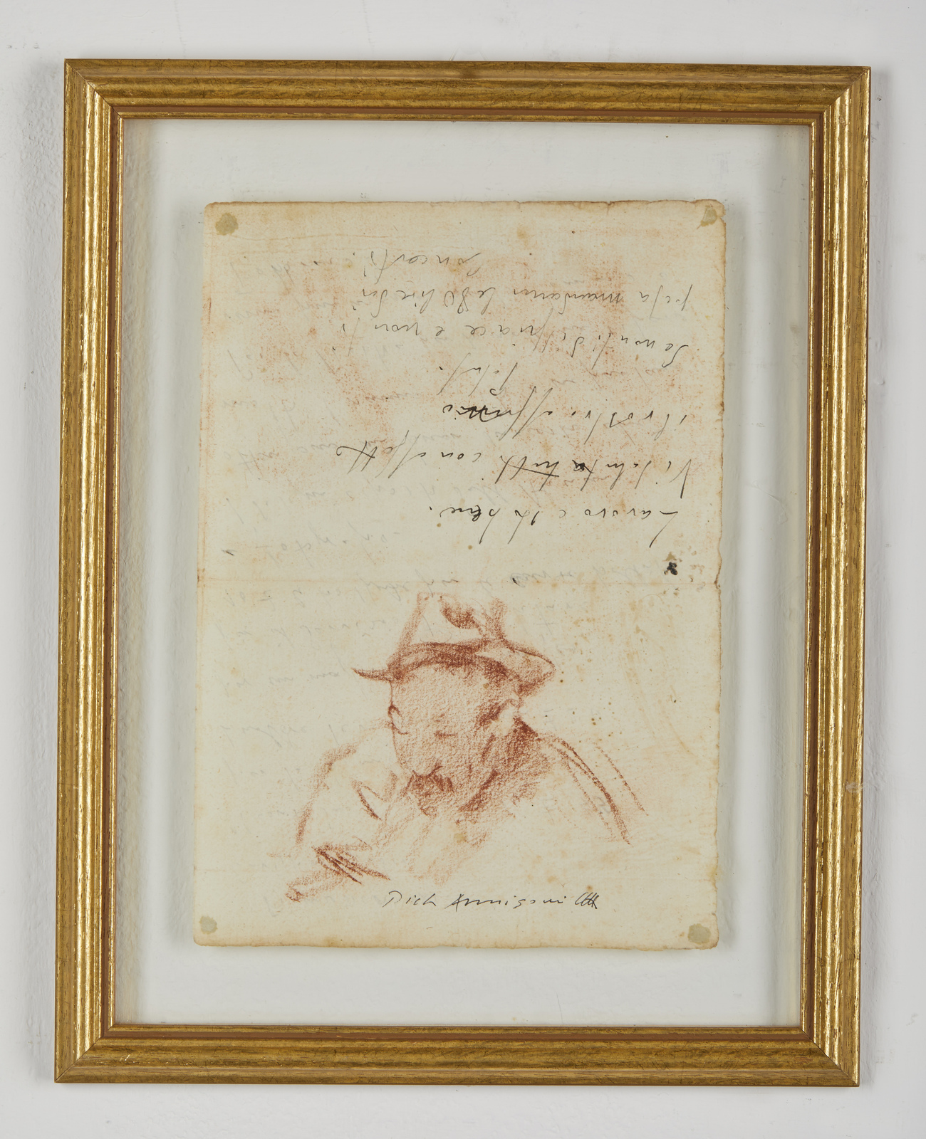 ANNIGONI PIETRO (1910 - 1988) Lettera al padre. . Lettera con disegno a sanguigna. Cm 14,50 x 20,50. Firma in basso al centro. Difetti. Cornice presente