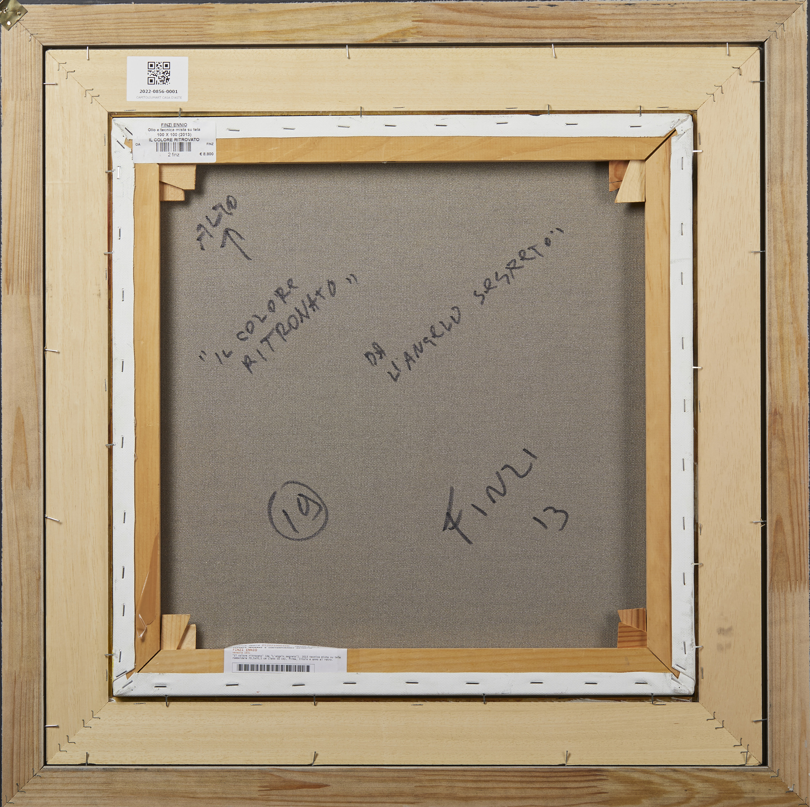 FINZI ENNIO (n. 1931) Il colore ritrovato (l'angelo segreto). . 2013. Tecnica mista su tela. Cm 50,00 x 50,00. Firma, titolo e anno al retro. Opera archiviato presso l'Archivio Ennio Finzi, Venezia-Mestre, come da documentazione fotografica allegata all'opera riportante il relativo numero d'inventario. Lievi difetti. . Cornice presente