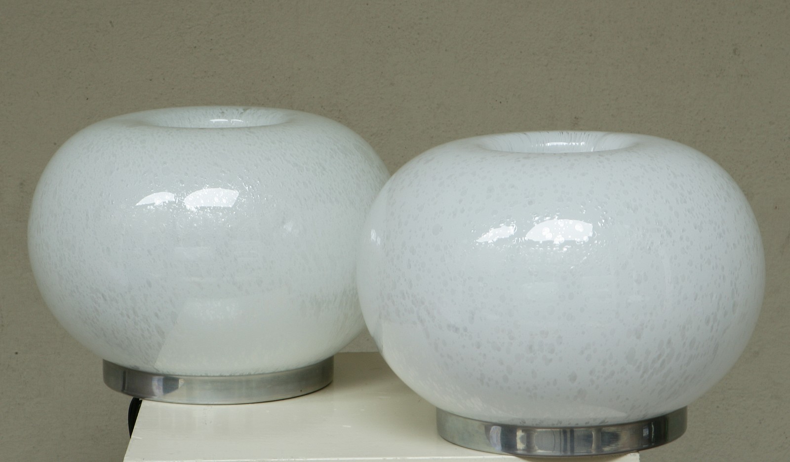ANONIMO. Due lampade da tavolo in vetro pulegoso bianco. Base in acciaio. Two table lamp in white glass. Steel base. Vetro. Cm 31x23,5.