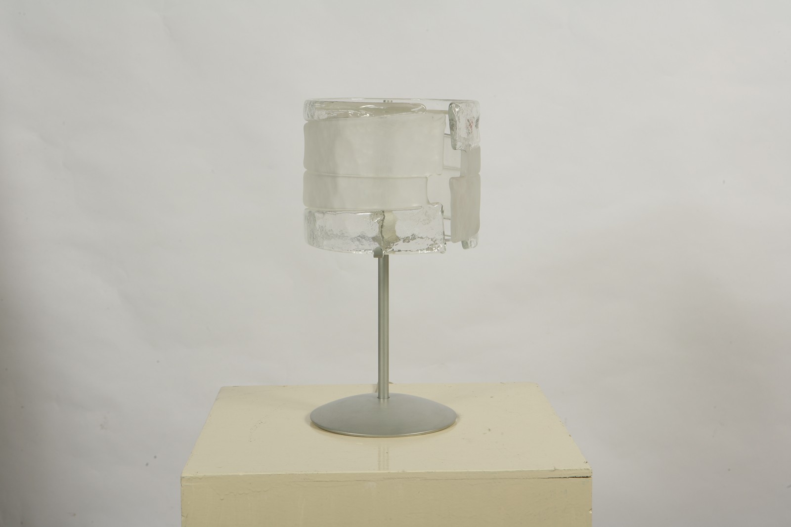 MAZZEGA AV. Lampada da tavolo. Table lamp. Metallo e vetro soffiato. Cm 19x36. Struttura in metallo, diffusore in vetro soffiato. Metal structure, blown glass diffuser. 1980.