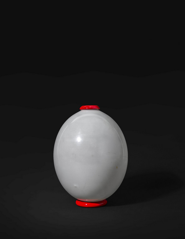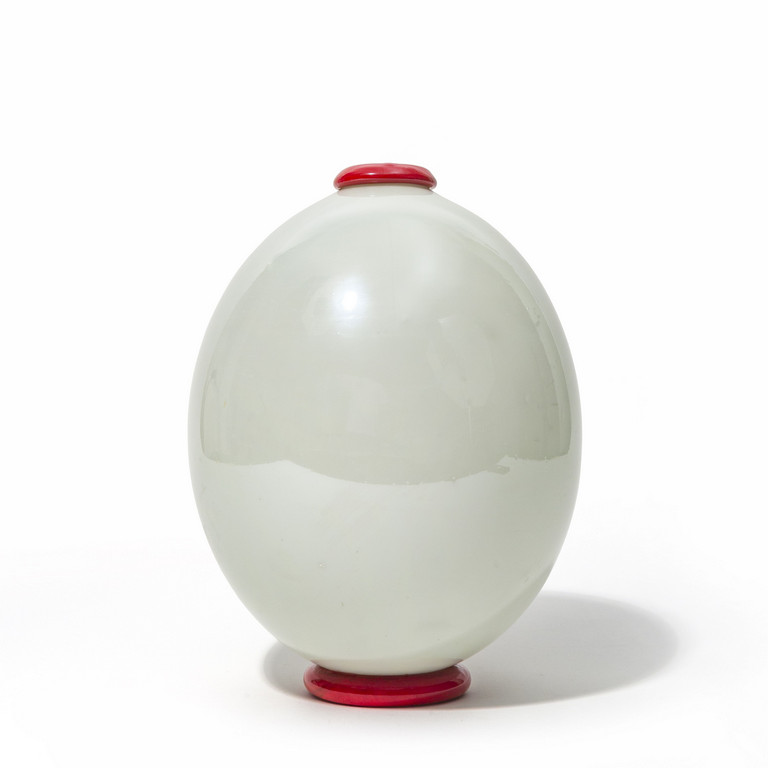Un vaso ovoidale in vetro lattimo iridato piede e bocca in pasta vitrea corallo modello 5952 1928