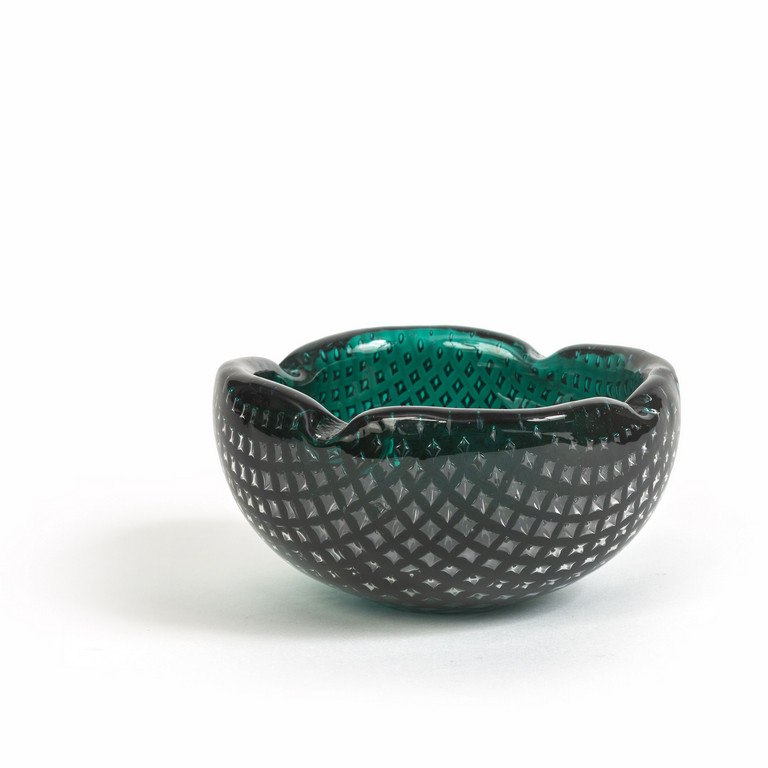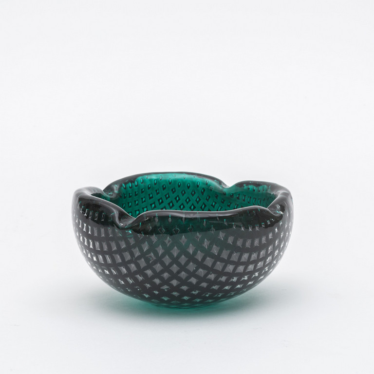 una coppa in vetro verde a bolle regolari anni '40 marca ad acido 'venini murano italia'