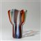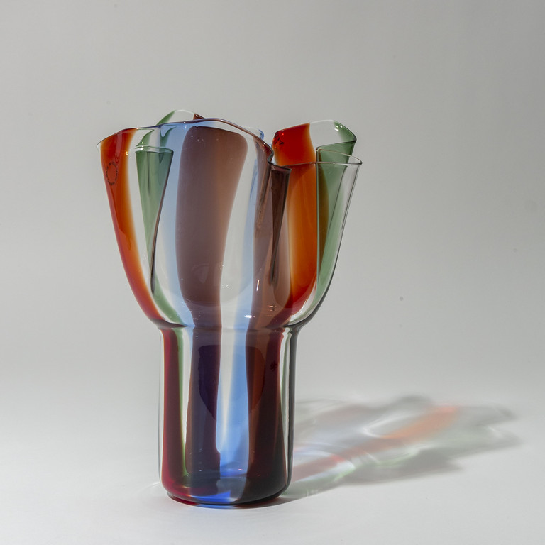 Un vaso 'kukinto' in vetro trasparente con fasce policrome verticali. La parte inferiore a cilindro si apre a fazzoletto verso l'alto. 1992.