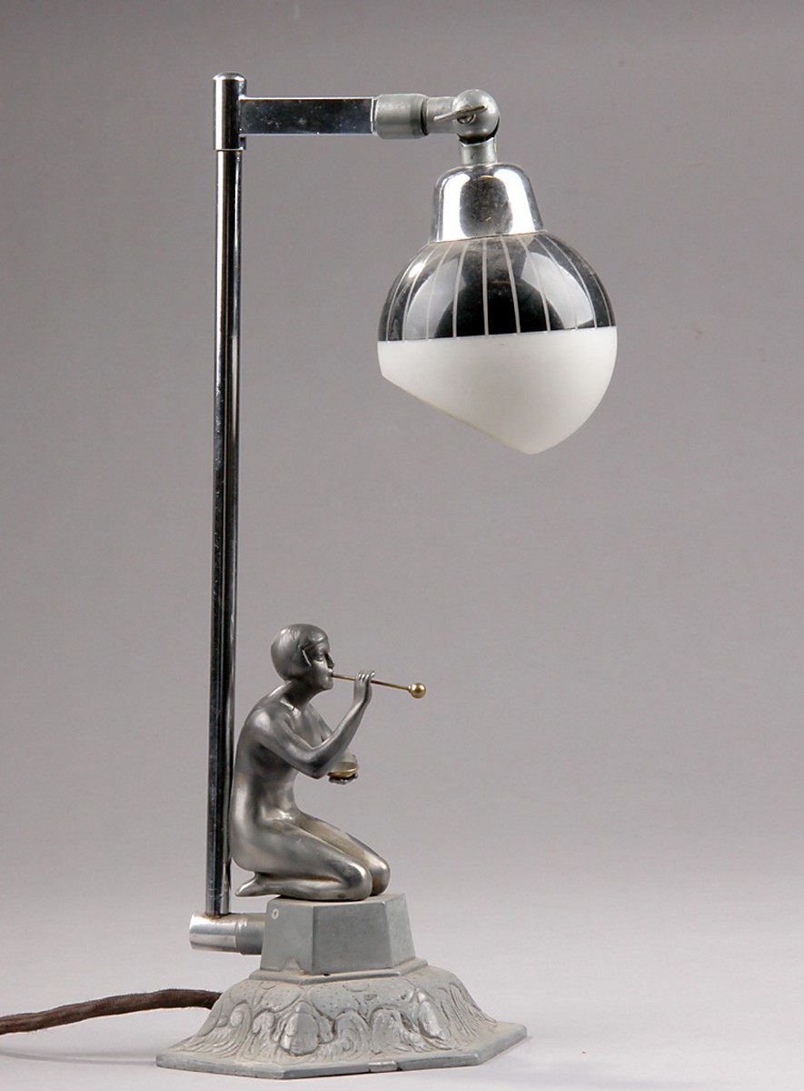 ART DECO'. Lampada da tavolo in metallo satinato e verniciato con cupola di vetro nero, statuetta di donna nuda alla base. 'Table lamp in brushed metal and painted black with a glass dome, statue of a naked woman at the base. Metallo e vetro. Cm 21x37x15. Difetti. Defects. 1920.