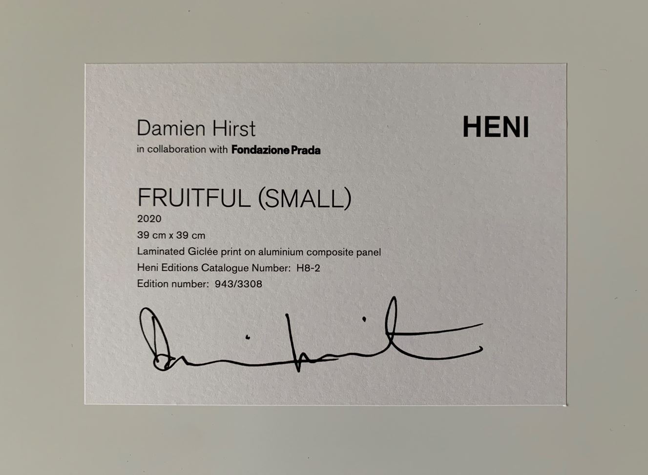 "Fruitful (Small) / H8-2". Year 2020. Laminated Giclée print on aluminium composite panel. Edition 943 of 3308. Size 39 x 39 cm (15.4 x 15.4 inches). Heni Editions label with the artist' signature on the back. Provenance: Private Collection, Zug (Switzerland).