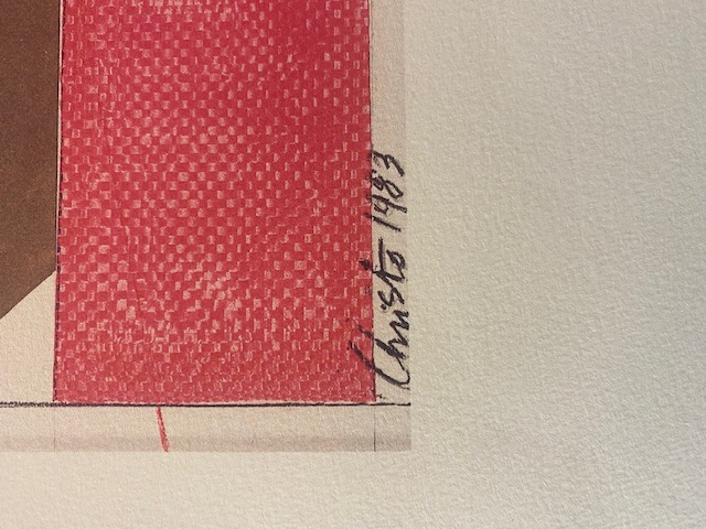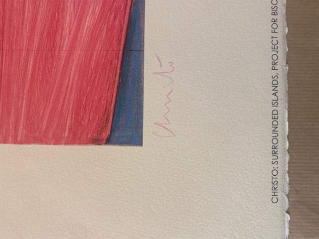"Surrounded Islands, Project for Biscayne Bay, Greater Miami, Florida - 1983". Size: cm 56,5 x 76,5 - in 22,3 x 30,1. Year 2003. Chromolithograph on museum cardboard. Edition of 350. Hand signed by Christo lower left, not numbered. Published and distribuited in 2003 by MACBA, Museo de Arte Contemporaneo de Barcellona. On the back COA with stamp, title and signature of Grafiche d'Arte Lombardi. Provenance: Private Collection, Alessandria (Italy).
