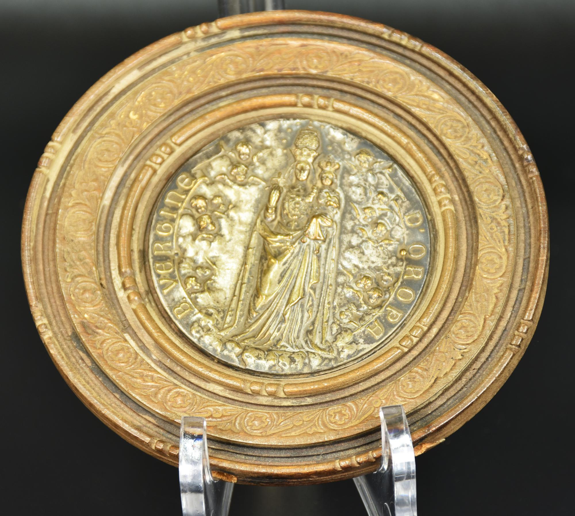 scultura in metallo argentato raffigurante la Beata Vergine d'Oropa entro cornice in legno finemento scolpito, diam cm 11