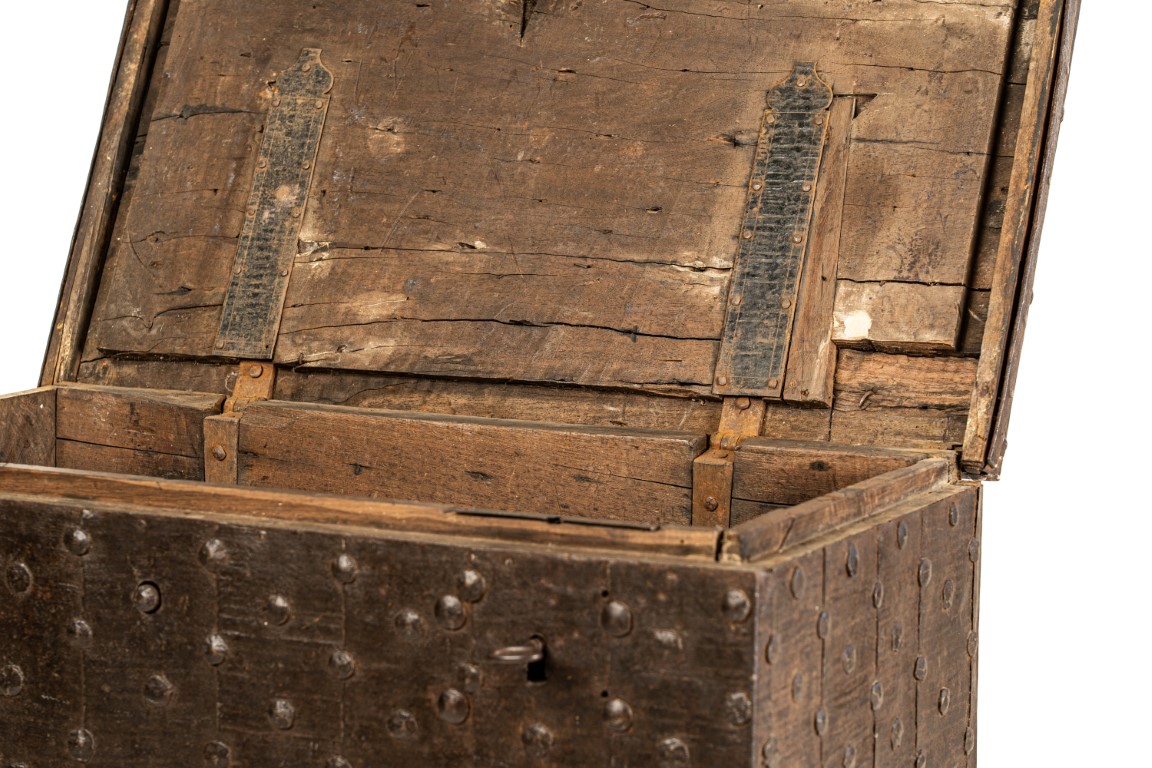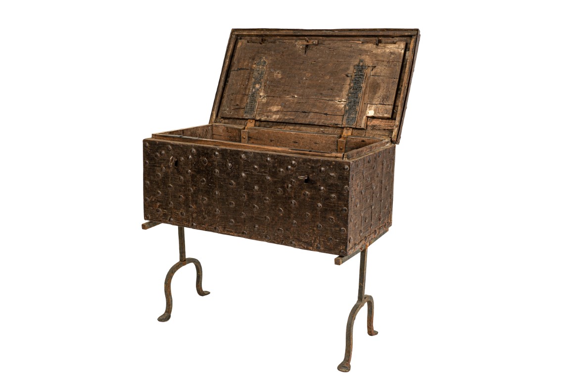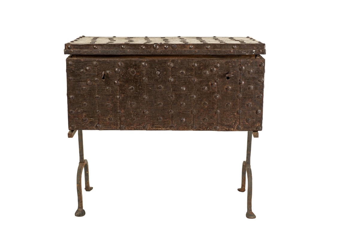interno in legno, con doppia serratura, corredato di base in ferro battuto di epoca posteriore