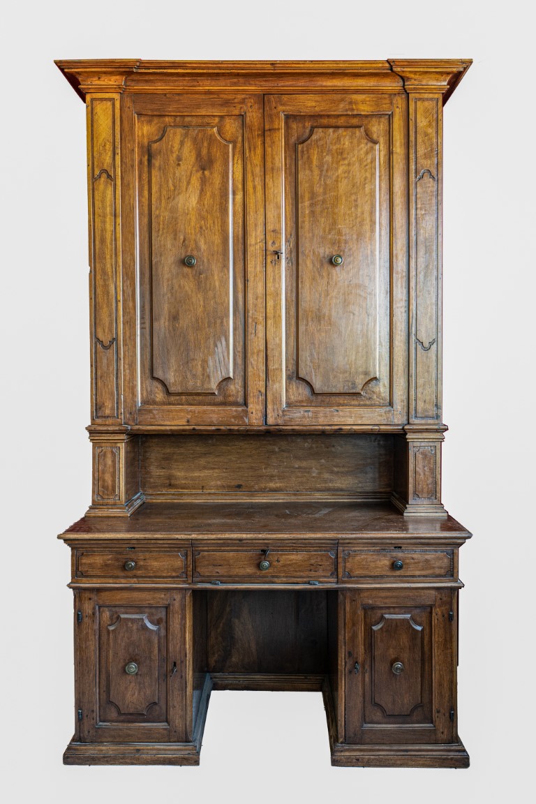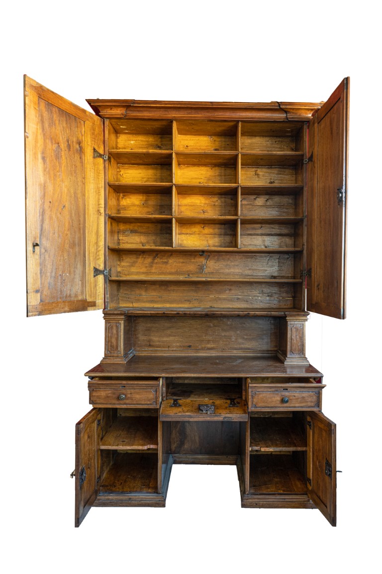a doppio corpo, parte superiore con cornice modanata, due sportelli scorniciati e vano interno a palchetti e scomparti a giorno, due cassetti segreti nel basamento; parte inferiore con piano con becco di civetta, due cassetti ed uno sportello sotto al piano e due sportelli scorniciati laterali sottostanti, base modanata