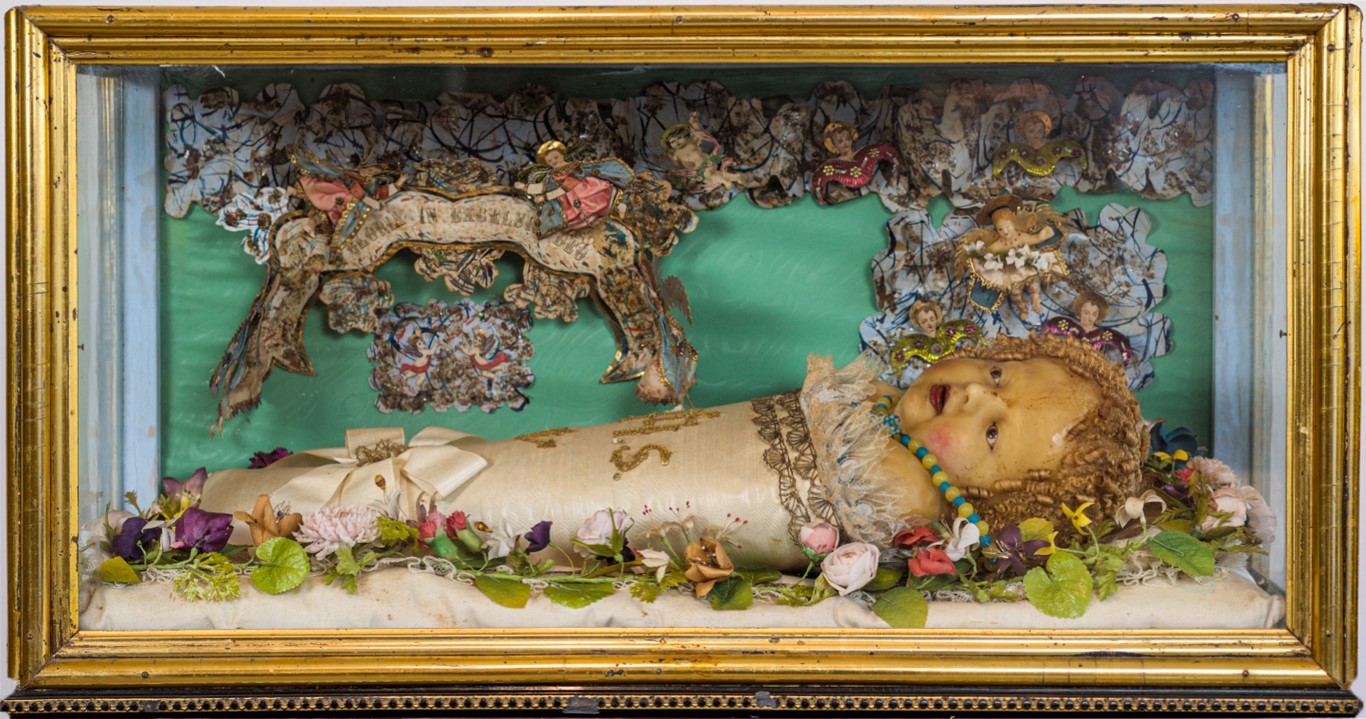 Rarissima scultura liturgica del Settecento raffigurante Gesù Bambino, in cera policroma disposto entro una teca in legno dell'inizio del XIX secolo. Il volto dolcissimo del bambino è magistralmente modellato grazie alla duttilità della cera d'api, con particolari dipinti a mano, capelli veri e stoffe databili al XVIII secolo. Le antiche sculture in cera sono in genere estremamente fragili e risultano spesso danneggiate, mentre la presente si distingue per uno stato di conservazione molto buono, nonché per un'altissima qualità del modellato.