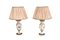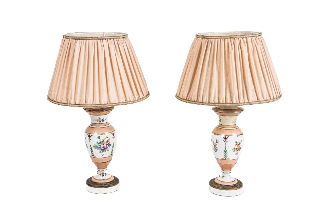 dipinti a composizioni floreali e lumeggiati in oro, con paralumi in stoffa plissettata e basi circolari in marmo