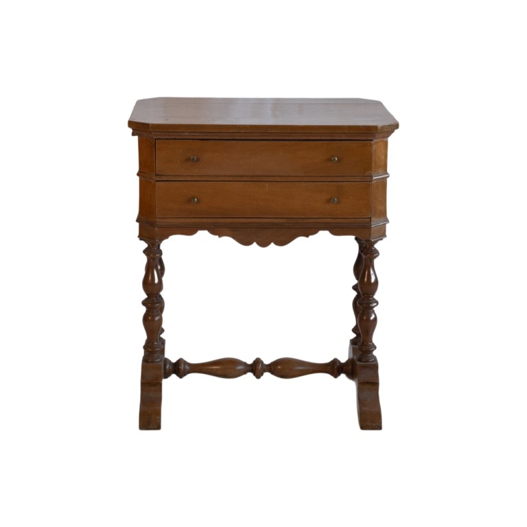 piano a forma rettangolare con angoli scantonati, due cassettini sottostanti, pendaglina sagomata frontale e laterale, piannacoli torniti angolari, gambe tornite riunite da traversa su piedi a ciabatta