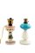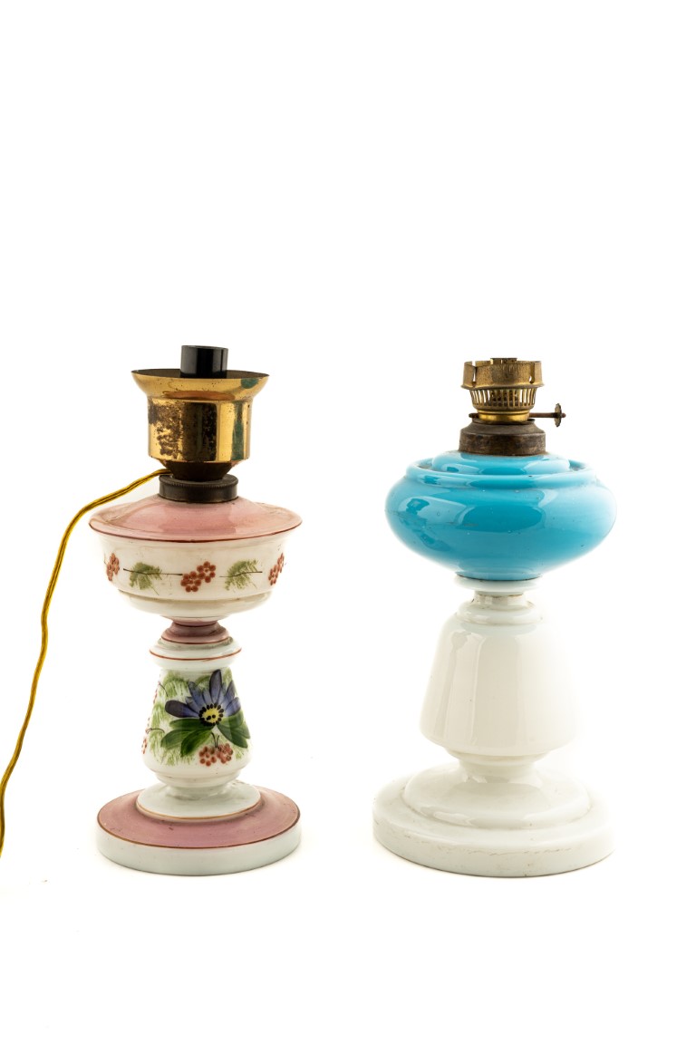 Lotto 132 | Due lumi a petrolio in opalina colorata