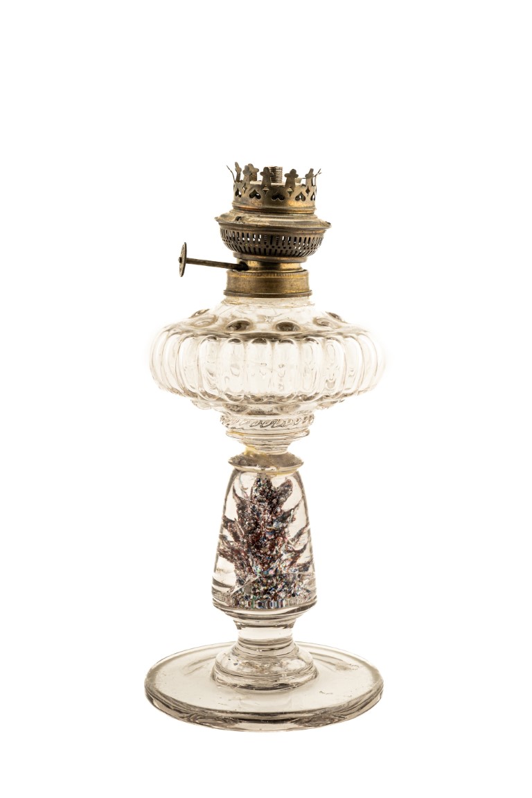 Lume a petrolio in vetro trasparente con inclusioni colorate