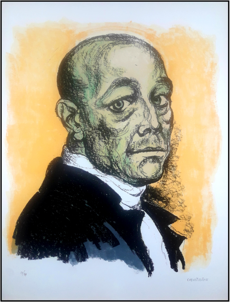 CANTATORE DOMENICO Ruvo di Puglia (BA) 1906 - Parigi 1998 "Autoritratto" Litografia a 8 colori su cartoncino cm 48x63 del 1975. Firma a matita e timbro a secco sul fronte in basso a destra, tiratura 55/99 a sinistra. Sul retro timbro e descrizione.