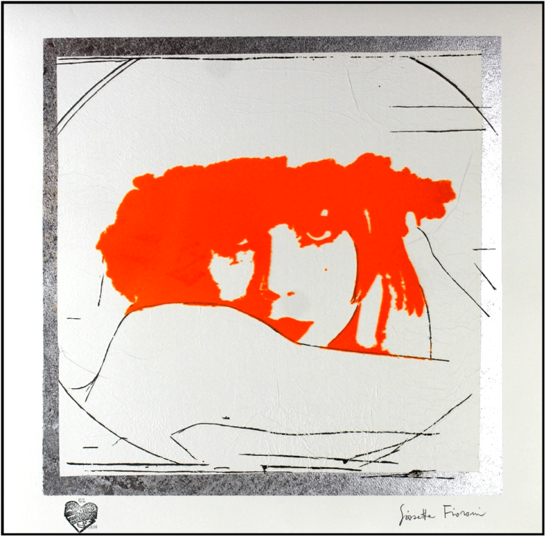 FIORONI GIOSETTA Roma 1932 "Doppio liberty arancio" Serigrafia materica con pigmento arancio cm 50x50, firmata sul fronte in basso a destra. Esemplare 54/100, certificato di autenticità a cura della Spirale Milano srl e autenticato dall'Archivio Parise Fioroni con timbro a secco.