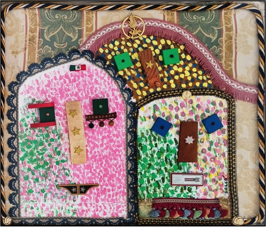 FALCO' PASQUALE Foggia 1952 "Senza titolo" Tecnica mista e collage su faesite, con applicazioni di passamaneria, tessuti e oggetti vari, cm 65x55. Opera incorniciata. Autentica su foto a cura dell'artista.