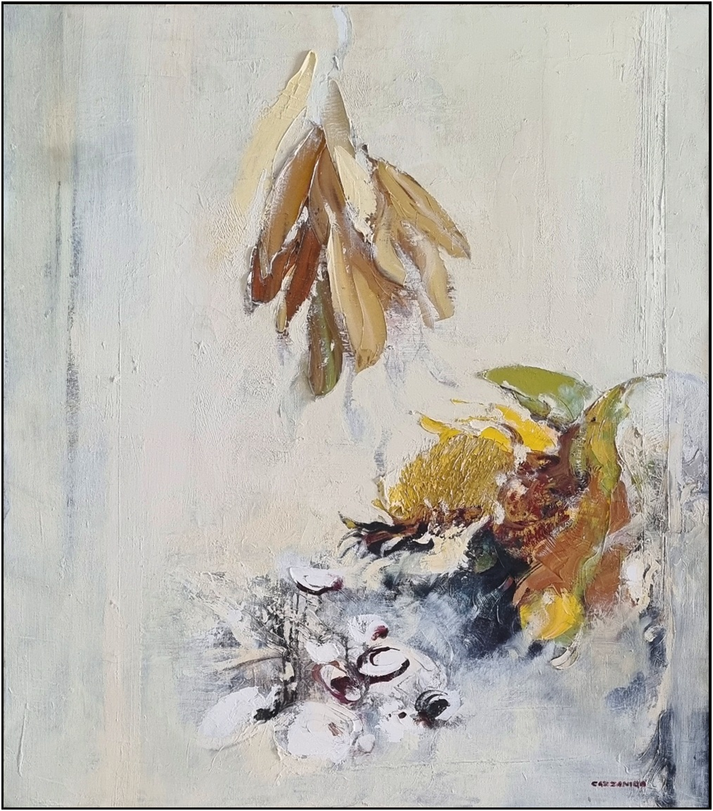 CAZZANIGA GIANCARLO Monza 1930 - 2013 "Interno" Olio su tela cm 80x90 del 1976-1985. Firmato sul fronte in basso a destra. Sul retro intitolato e datato.