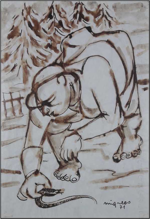 MIGNECO GIUSEPPE Messina 1903 - Milano 1997 "Il Serparo" Tecnica mista su carta applicata su tela cm 20x30 del 1971. Firmato e datato sul fronte in basso a destra. Sul retro timbro. Opera pubblicata sul catalogo generale. Archiviazione su foto.