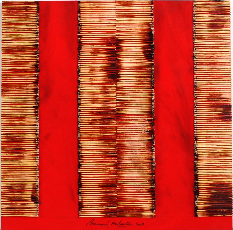 AUBERTIN BERNARD Fontenay aux Roses (FRANCIA) 1934 - GERMANIA 2015 "Senza titolo" Fiammiferi applicati su tavola rossa cm 60x60 del 2008. Firmata e datata sul fronte in basso al centro. Archivio Rosenberg. Opera pubblicata sul catalogo "Feur sur bois" a pag. 108.