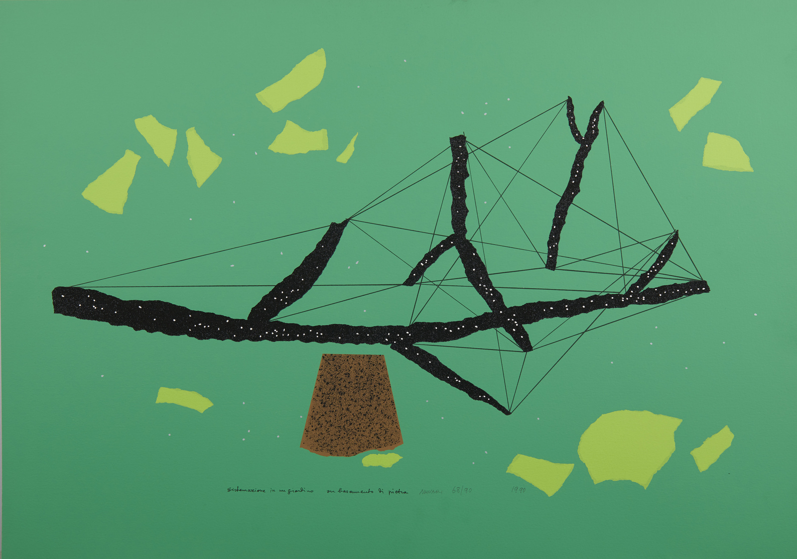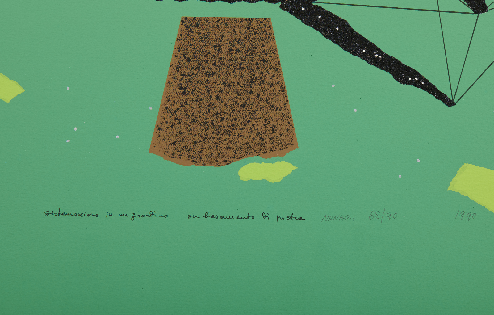 MUNARI BRUNO (1907 - 1998) Sistemazione in un giardino su basamento di pietra. 1990. Serigrafia e floccaggio. Cm 69,00 x 49,00. 68/90. Tiratura, firma, anno e titolo in basso a matita