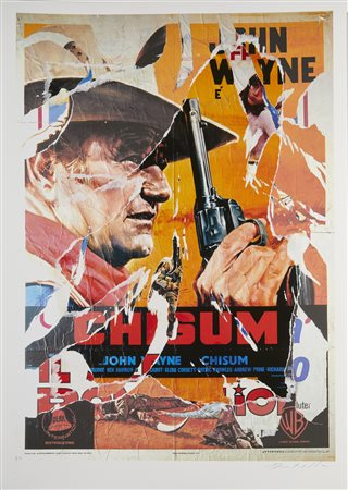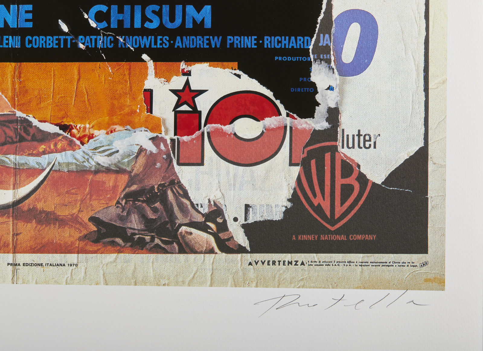 ROTELLA MIMMO (1918 - 2006) Chisum. Serigrafia e decollage su carta. Cm 70,00 x 100,00. P.A. Tiratura e firma in basso a matita. Timbro a secco della Fondazione Rotella, Millano, in basso a sinistra. Pubblicazione: Mimmo Rotella multiples décollages a cura di Elena Pontiggia, Silvana Editoriale, p.60