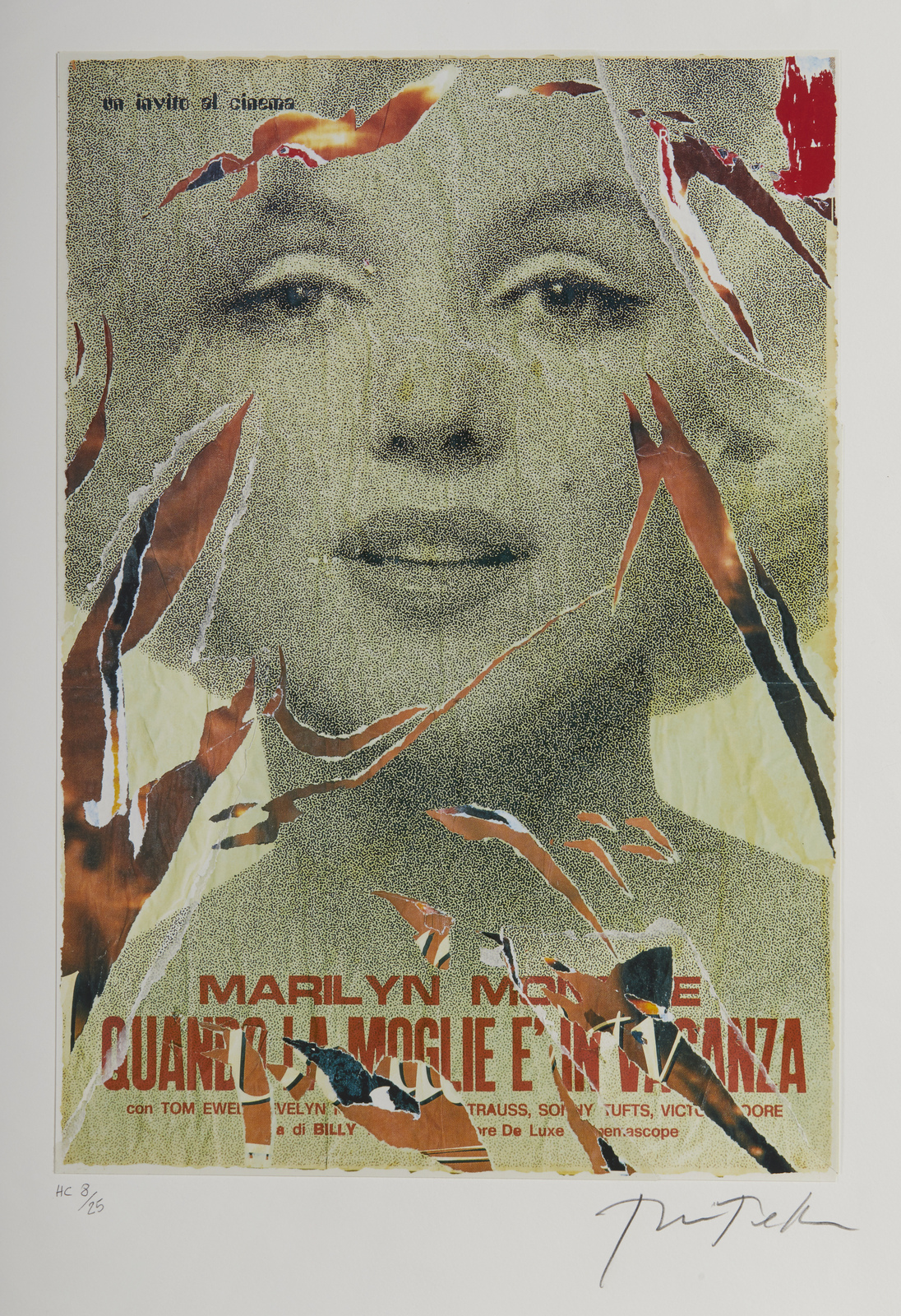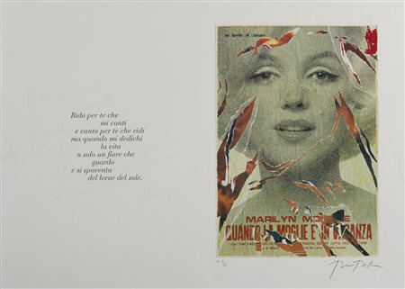 ROTELLA MIMMO (1918 - 2006) Quando la moglie va in vacanza. Litodecollage. Cm 70,00 x 50,00. HC 8/25. Tiratura e firma in basso a matita.Grafica proveniente dal volume "Marilyn Bellezza eterna”, di Mimmo Rotella e Alda Merini. Ogni foglio è abbinato ad una poesia inedita di Alda Merini.